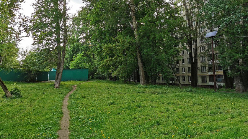 На площадке уложено устойчивое к вытаптыванию травяное покрытие, обустроен участок с элементами геопластики (искусственные холмы), покрытый резиновой крошкой, а также участок с песком и мульчой. Проложены дорожки для хозяев.