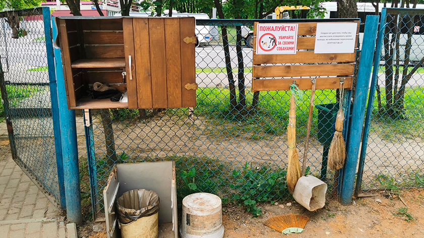 Площадка оснащена специальным входом-тамбуром с двойными воротами, которые предотвращают случайный выход собак с огражденной территории.А на выходе стоит дог-бокс (урна для уборки за собаками) и контейнер для раздельного сбора мусора.