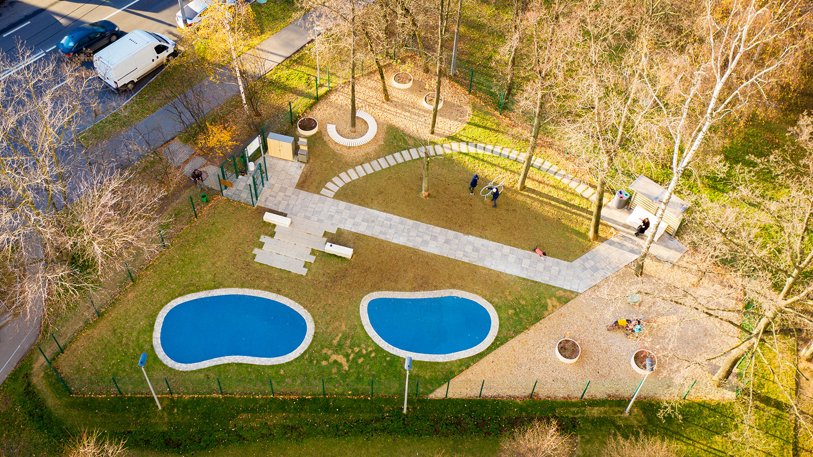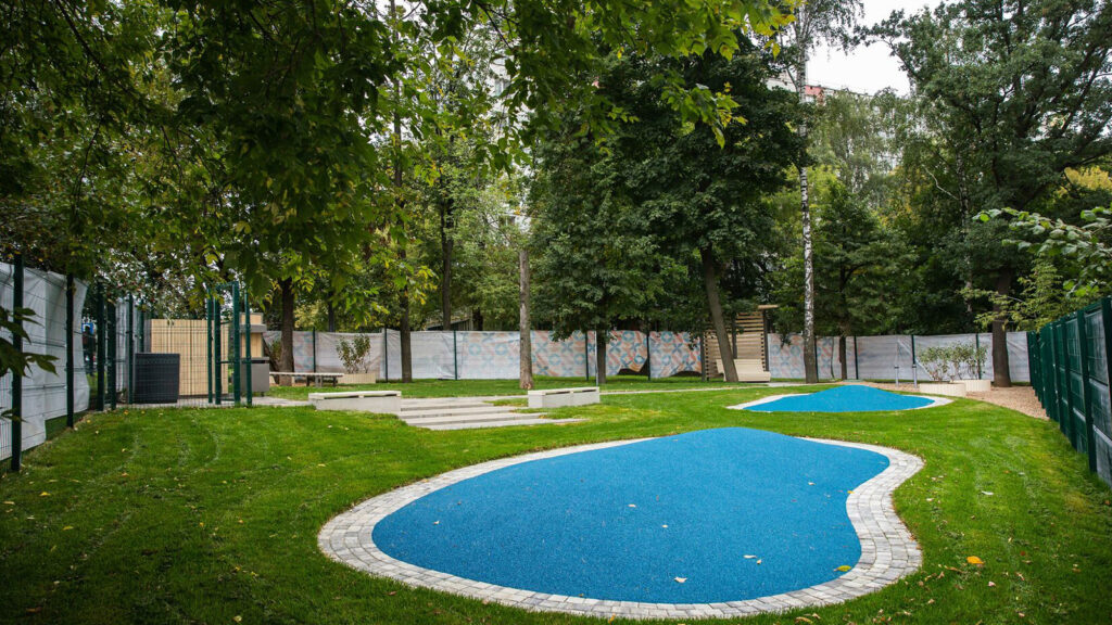 На площадке уложено травяное покрытие, обустроен участок с элементом геопластики (искусственные холмы), покрытый резиновой крошкой, а также участок с мелкофракционным гравием. Проложены дорожки для хозяев.