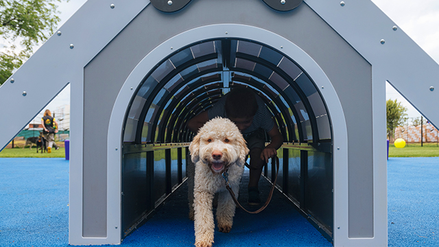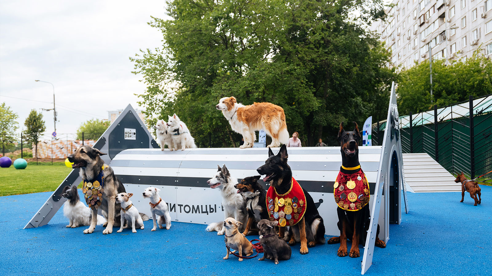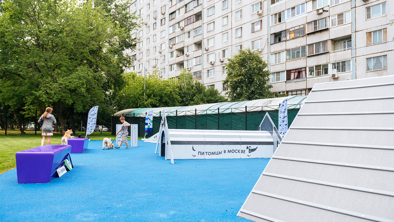 Территория площадки разделена на функциональные зоны: зону свободного выгула и тренировочную. На площадке установлено несколько видов снарядов для дрессировки, таких как бум, барьер, мостик. Для владельцев собак организована зона отдыха под навесом.