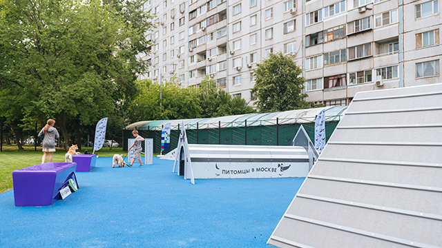На площадке используется разное покрытие: устойчивое к вытаптыванию травяное покрытие в зоне свободного выгула, нескользящее покрытие из резиновой крошки в тренировочной зоне, на входной группе – бетонная брусчатка, а из тротуарной плитки выполнены дорожки для хозяев.