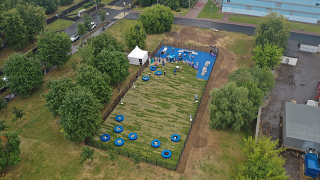 На площадке используется разное покрытие: EPDM-крошка в тренировочной зоне, рулонный газон в зоне свободного выгула, бетонная брусчатка на входной группе.