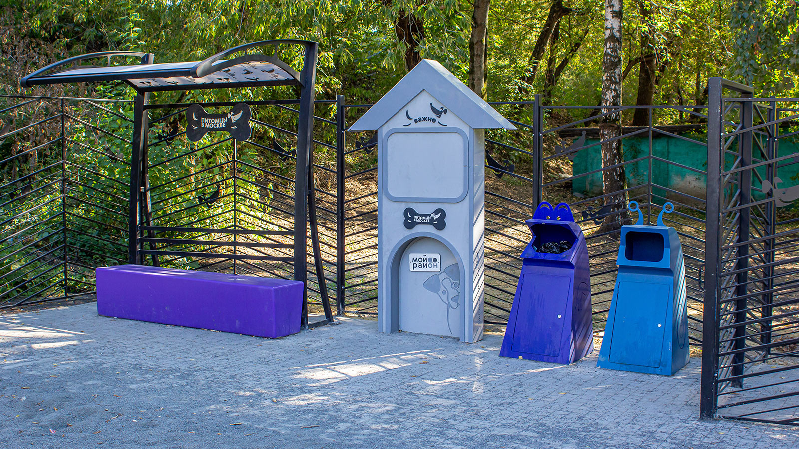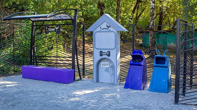 Для хозяев на площадке организовали зону отдыха со скамейками. Кроме того, установили контейнеры для уборки за питомцем и информационный стенд.