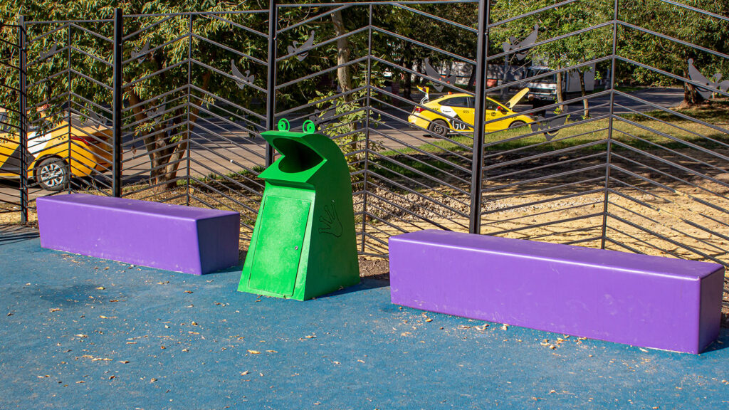 Зона с тренажёрами оборудована нескользящим покрытием из резиновой крошки. Вся территория площадки защищена ограждением, для хозяев с любимцами установлен вход с тамбуром и двумя калитками.