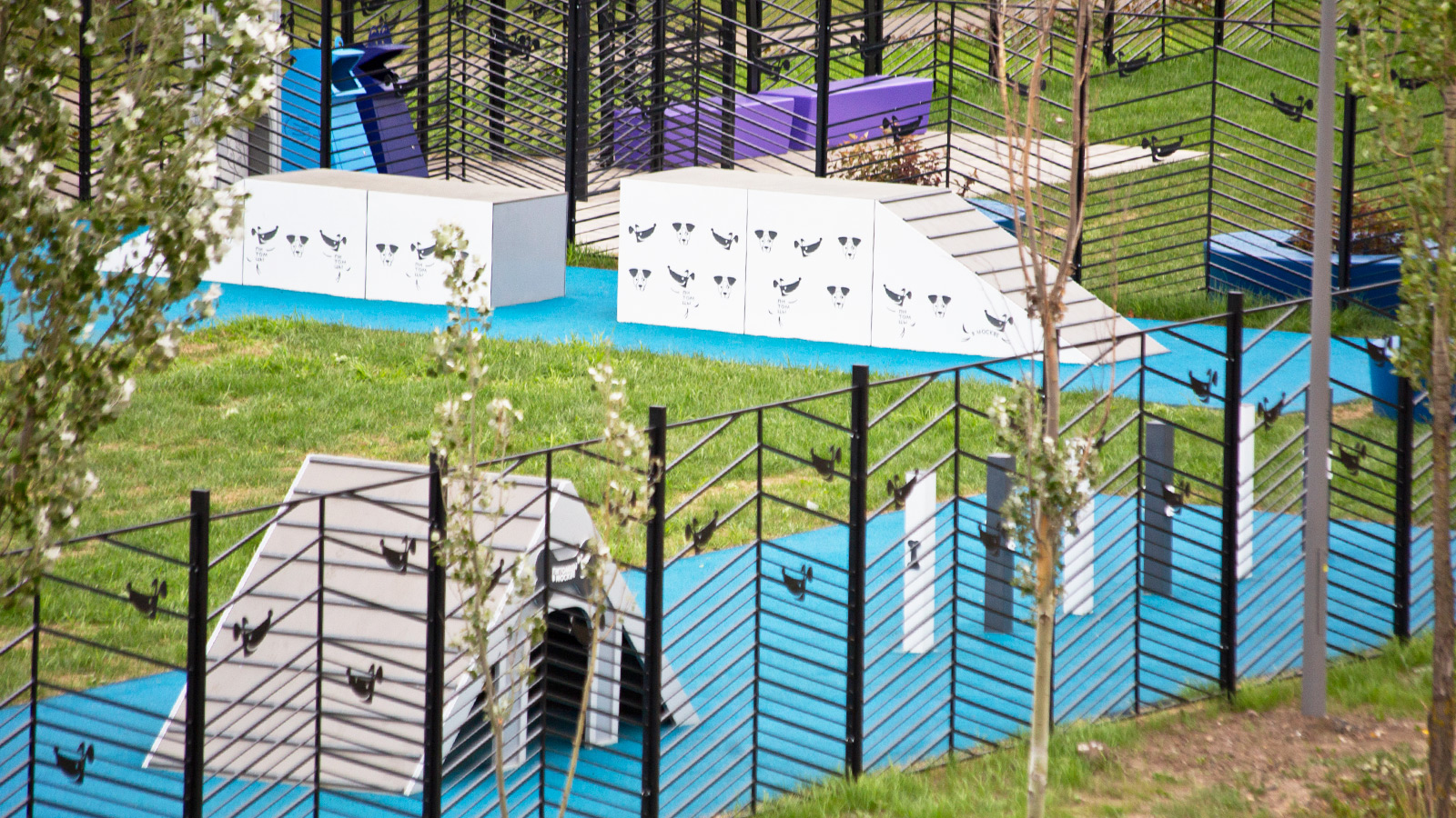 На пространстве, предназначенном для свободного выгула, уложен газон, чтобы собакам было комфортно бегать.