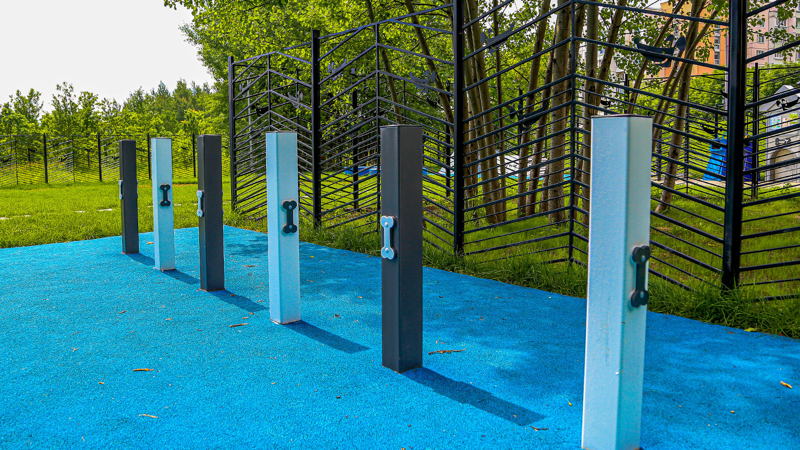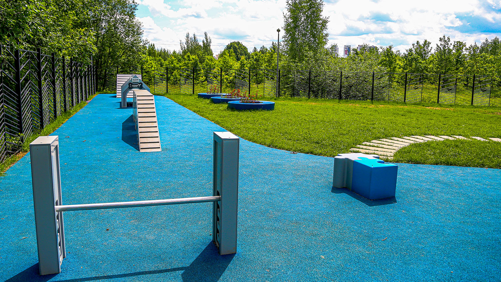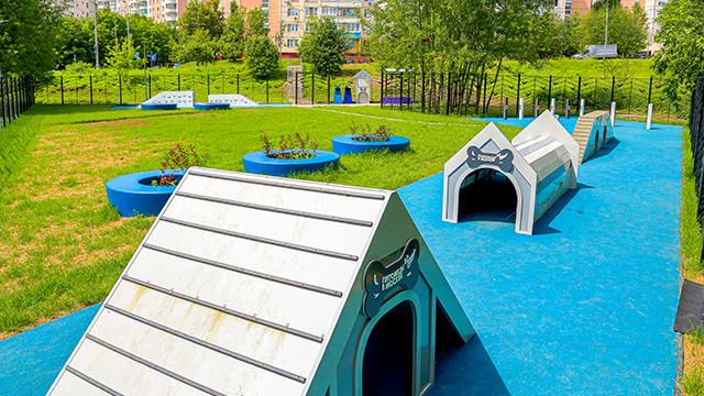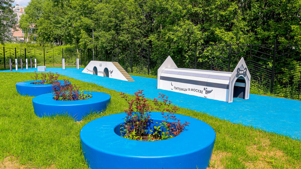 На новой площадке установлены самые современные снаряды для животных. Есть наклонная стенка для развития координации домашнего любимца, слалом, барьер-перекладина для прыжков, окоп, тоннель, которые поможет собаке преодолеть страх замкнутых пространств. В качестве покрытия у тренировочных снарядов используется резиновая крошка, а в зоне свободного выгула уложен газон. Для владельцев собак организована зона отдыха под навесом.