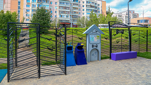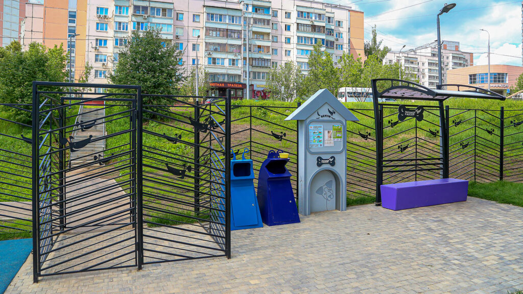 По новому стандарту площадка оснащена специальным входом-тамбуром с двойными воротами, которые предотвращают случайный выход собаки за пределы ограждённой территории. Установлены специальные контейнеры для уборки за питомцами и информационный стенд, где будет размещаться актуальная информация для владельцев собак о проводимых в районе профилактических прививках, сервисе о потерянных и найденных животных и т.д.