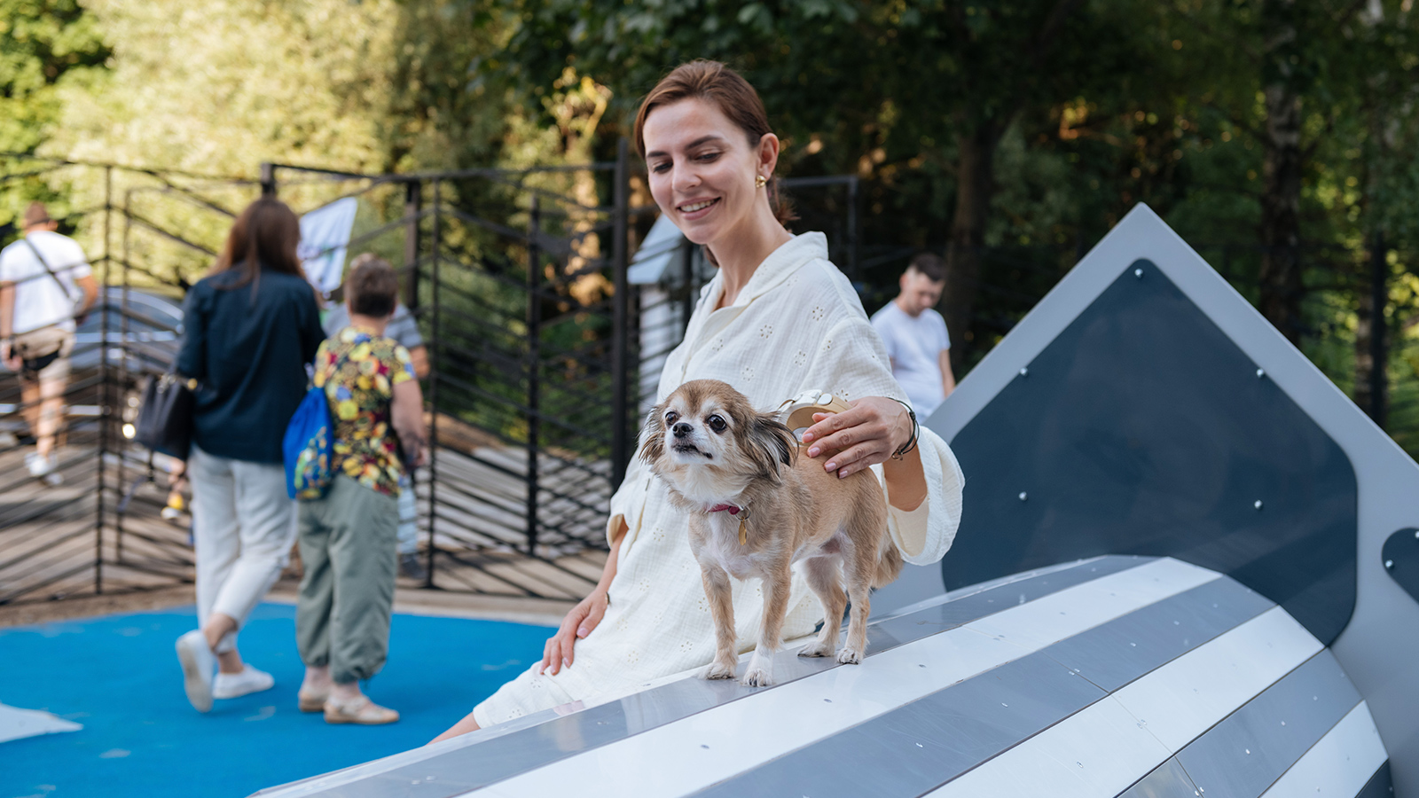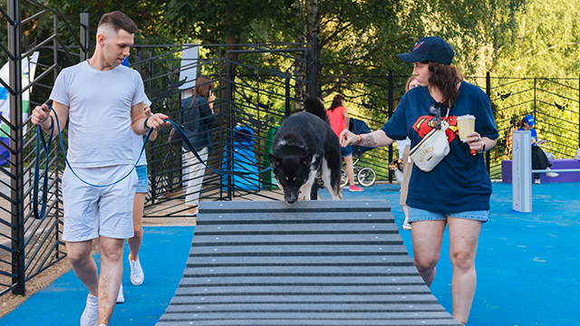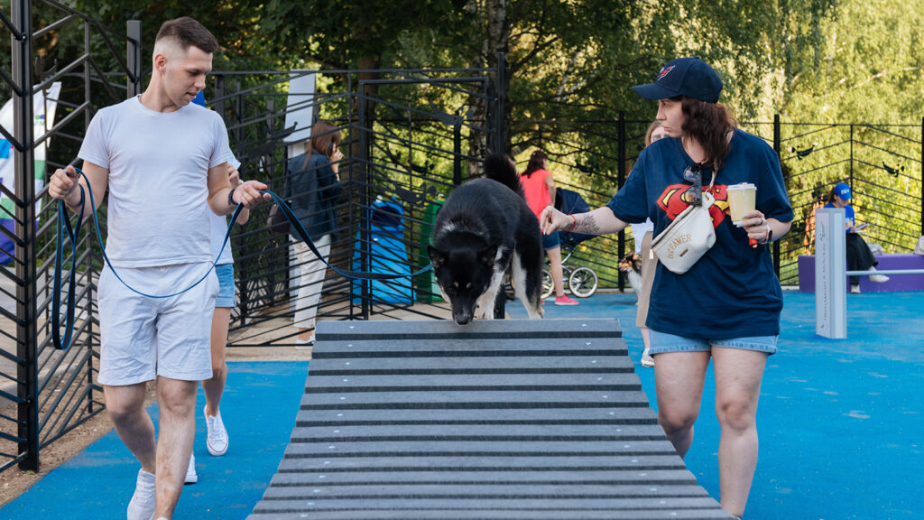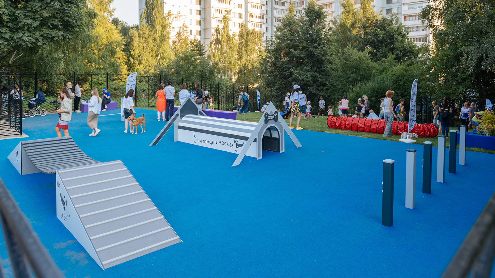 Территория площадки для выгула и дрессировки собак разделена на функциональные зоны: выгульную и тренировочную, на которой установлены несколько видов снарядов для дрессировки, таких как бум, барьер, мостик. Для владельцев собак организована зона отдыха под навесом.