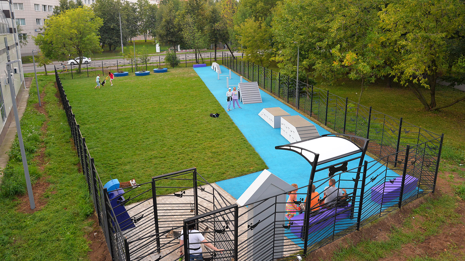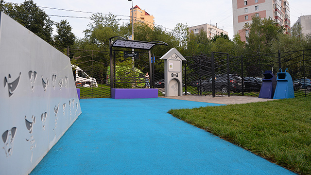 До благоустройства на месте этой площадки был неосвещённый пустырь. Теперь здесь появился полноценный комплекс, в котором есть пространство и для выгула домашних любимцев, и для тренировок, и для отдыха на удобных лавочках под навесом.