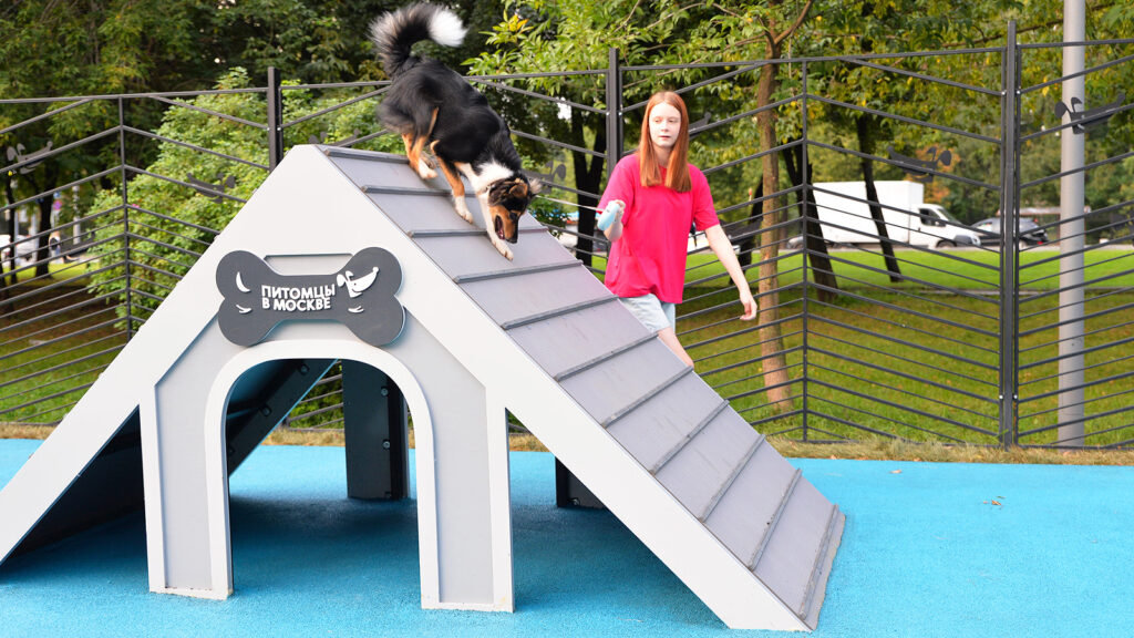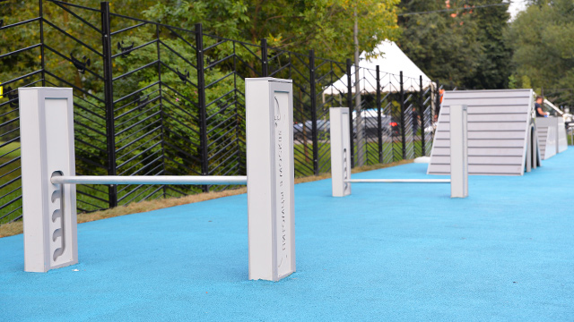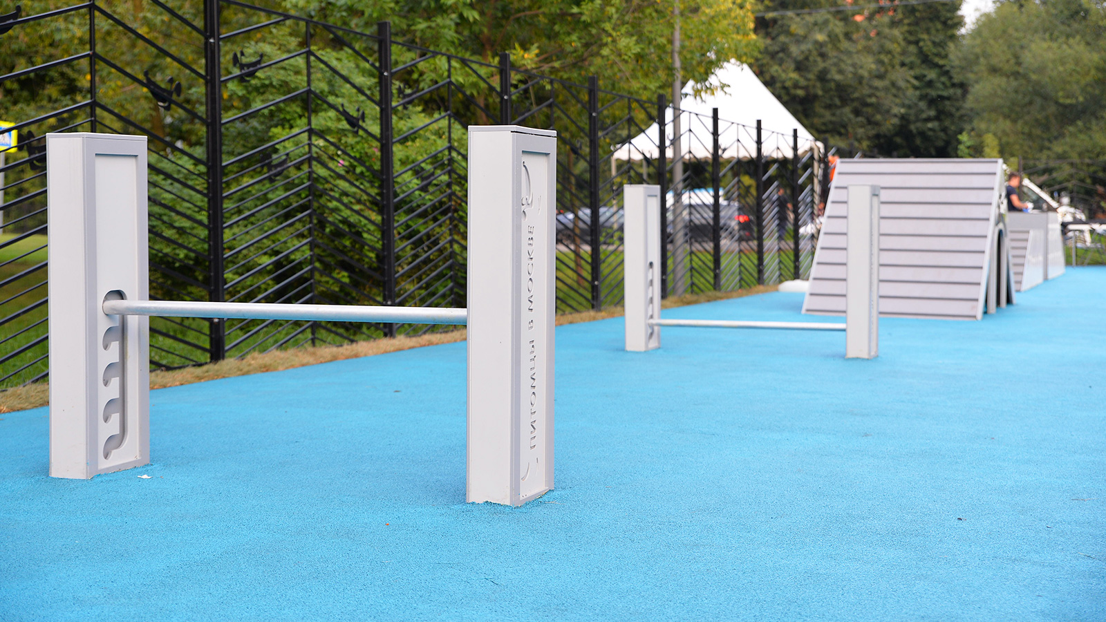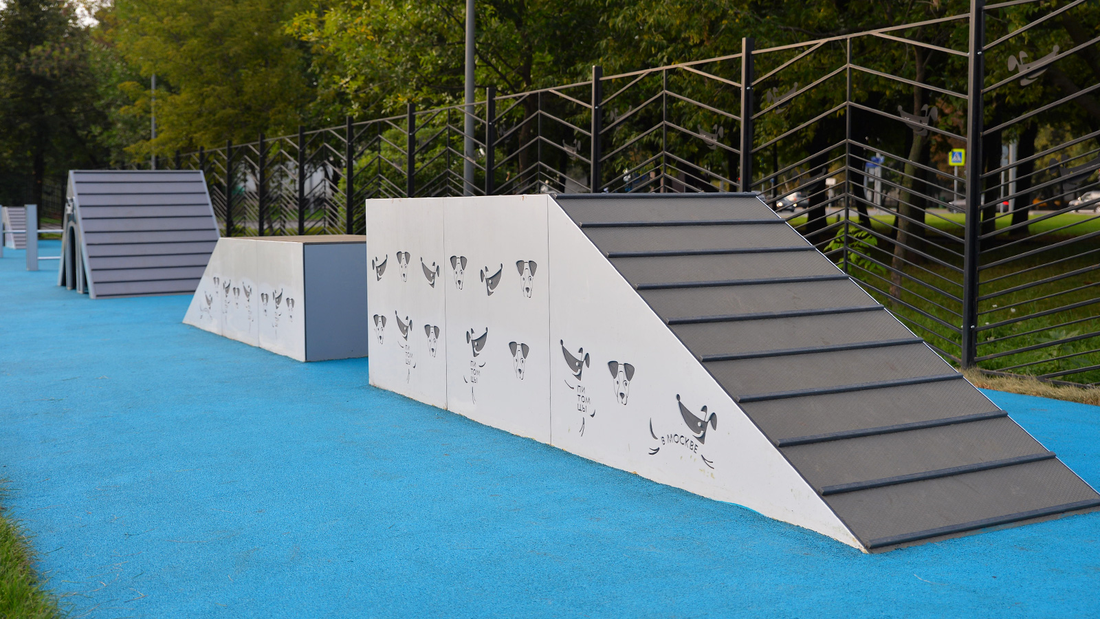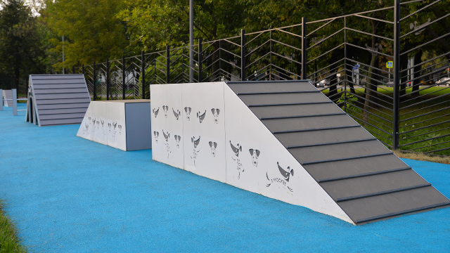 На площадке установлены различные снаряды для дрессировки: бум, барьер, тоннель. Для владельцев собак организована зона отдыха под навесом.