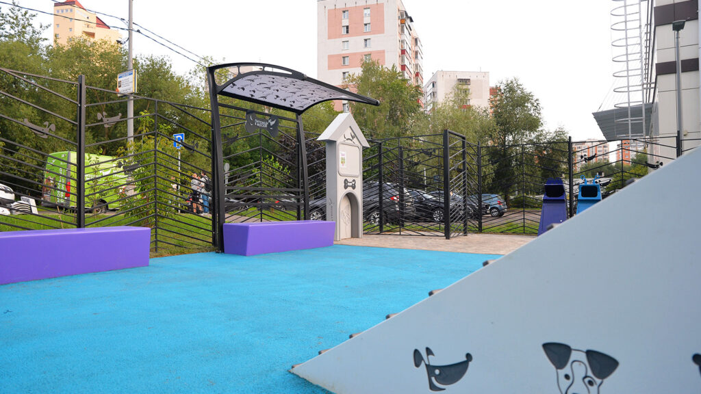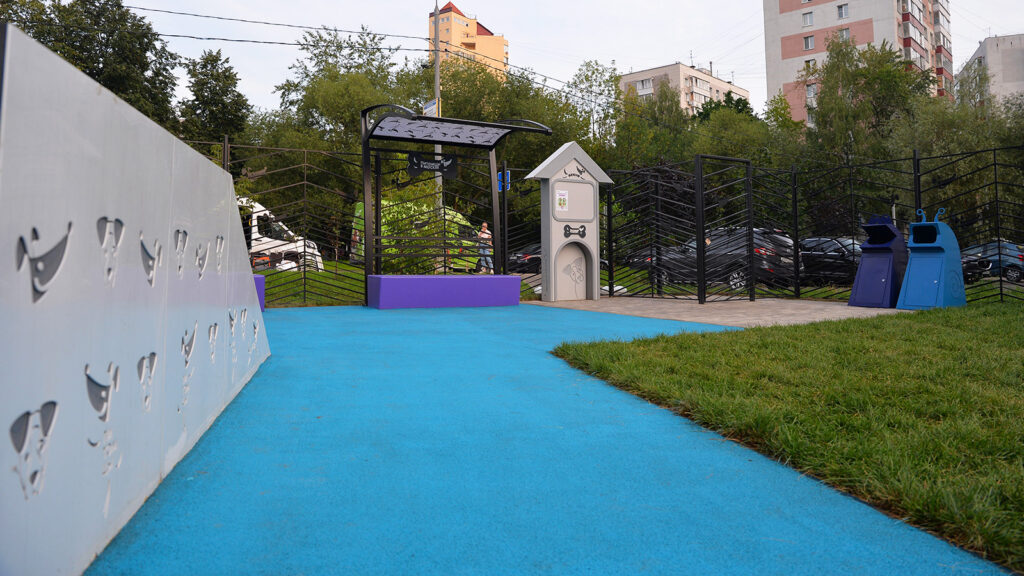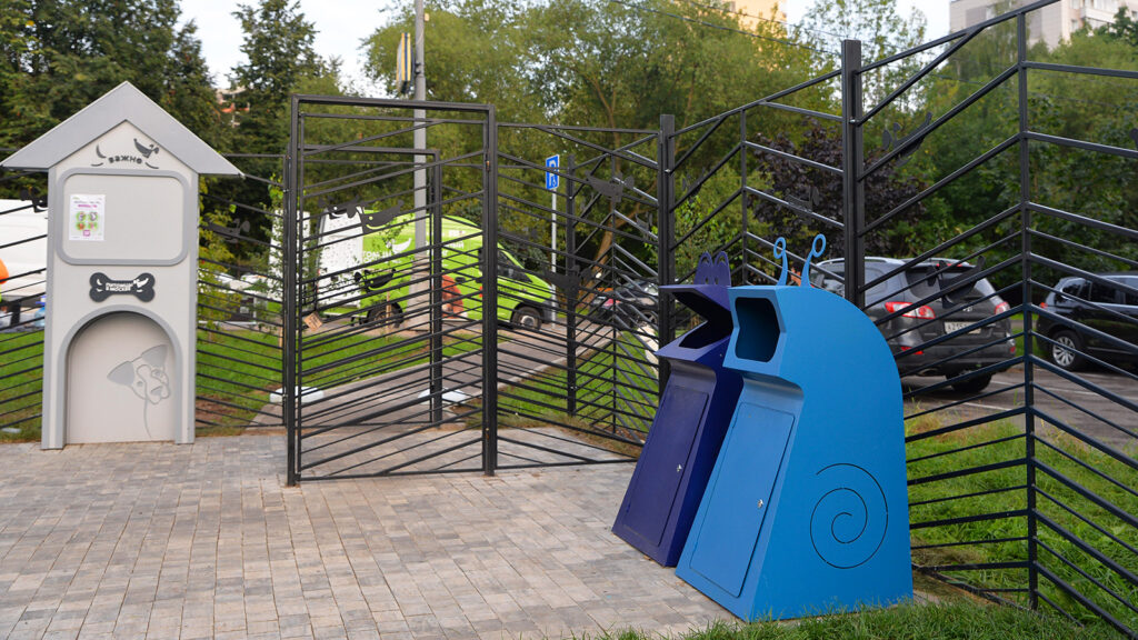 Площадка оснащена специальным входом-тамбуром с двойными воротами, которые предотвращают случайный выход собаки за пределы ограждённой территории. Установлены специальные контейнеры для уборки за питомцами и стенды с актуальной информацией для владельцев собак.