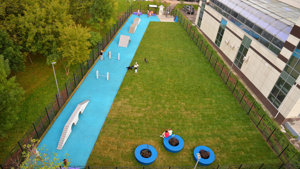 На площадке используется разное покрытие: EPDM-крошка в тренировочной зоне, рулонный газон в зоне свободного выгула, бетонная брусчатка на входной группе.