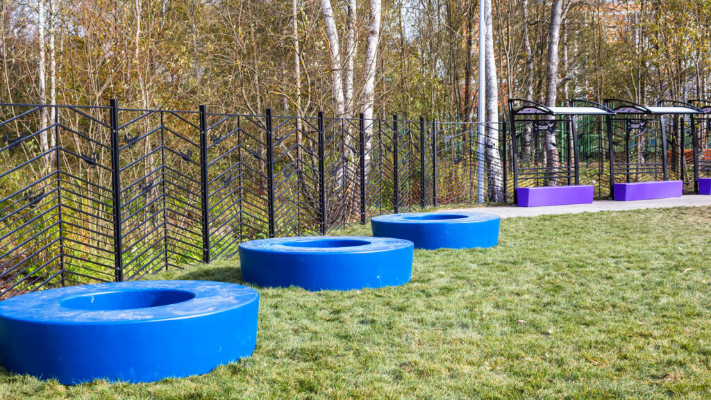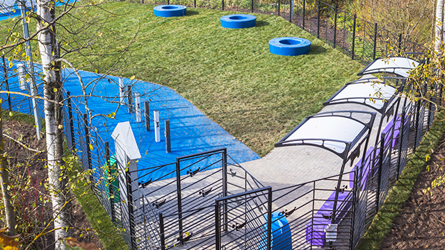 В зоне для дрессировки установлены самые современные снаряды. В их числе: тренажер-слалом для развития координации движений, барьер-перекладина для прыжков, а также бум, чтобы быть смелыми и научиться координации движений. В качестве покрытия у тренировочных снарядов используется покрытие из резиновой крошки.