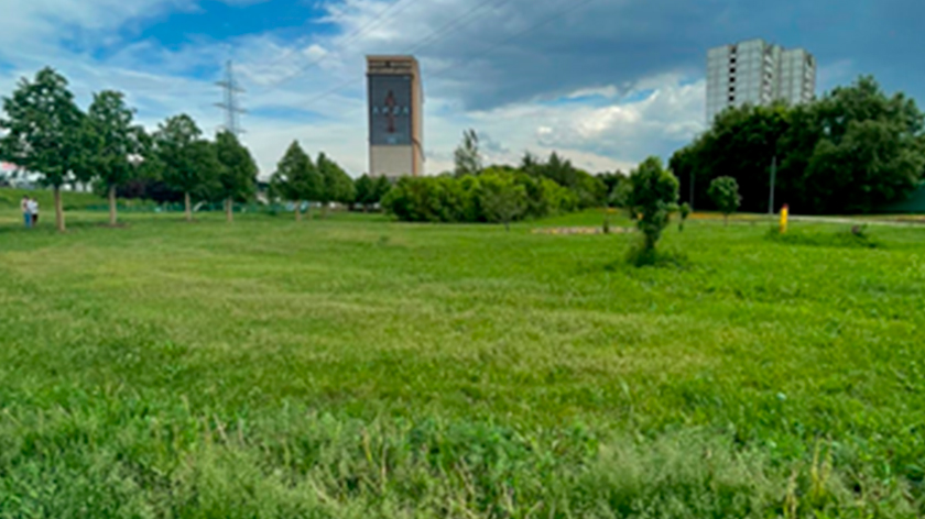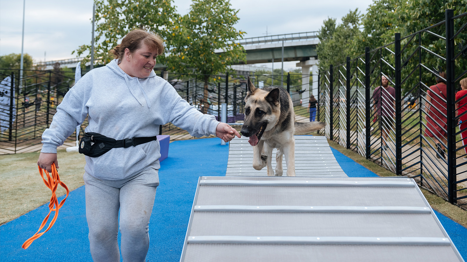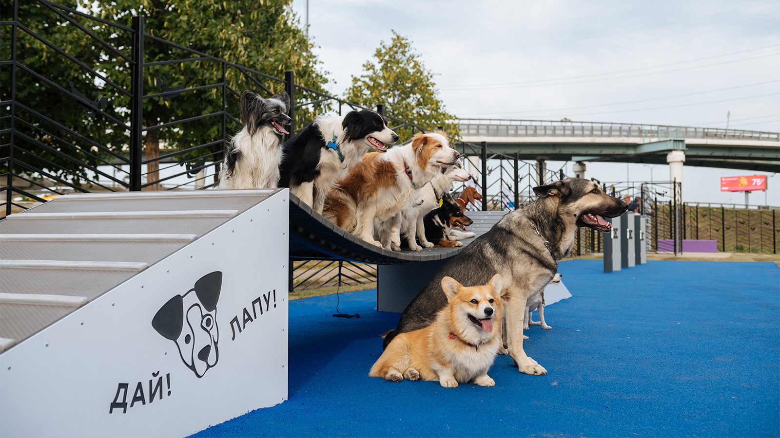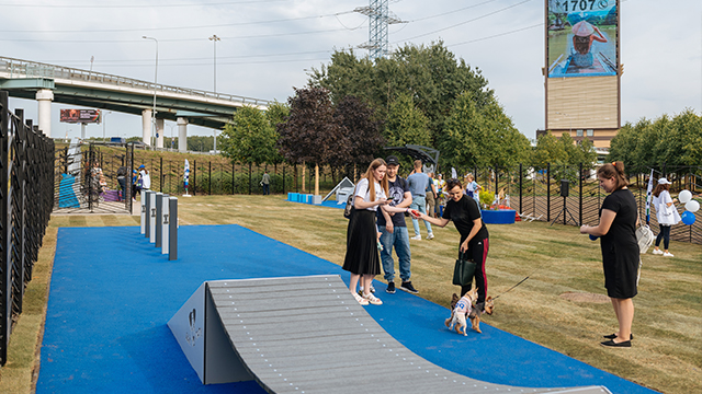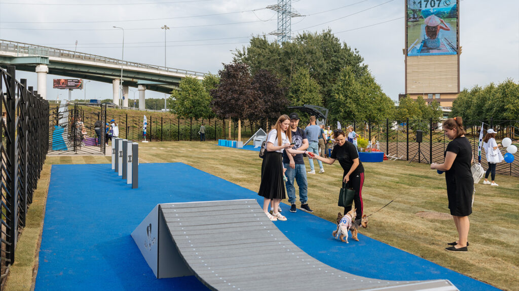 На площадке используется разное покрытие: устойчивое к вытаптыванию травяное покрытие в зоне свободного выгула, нескользящее покрытие из резиновой крошки в тренировочной зоне, на входной группе – бетонная брусчатка, а из тротуарной плитки выполнены дорожки для хозяев.