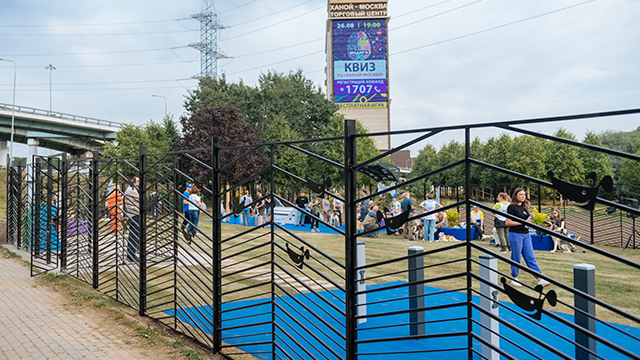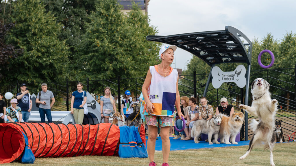 Территория площадки разделена на функциональные зоны: зону свободного выгула и тренировочную. На площадке установлено несколько видов снарядов для дрессировки, таких как бум, барьер, мостик. Для владельцев собак организована зона отдыха под навесом.