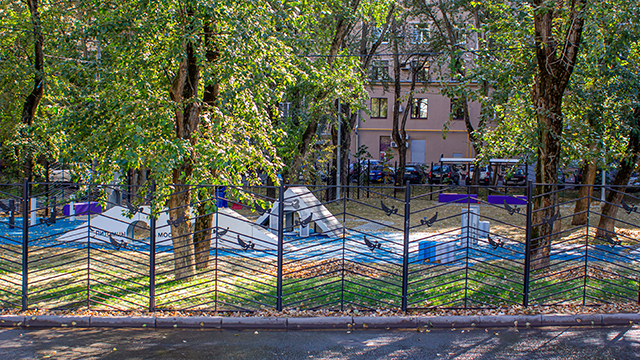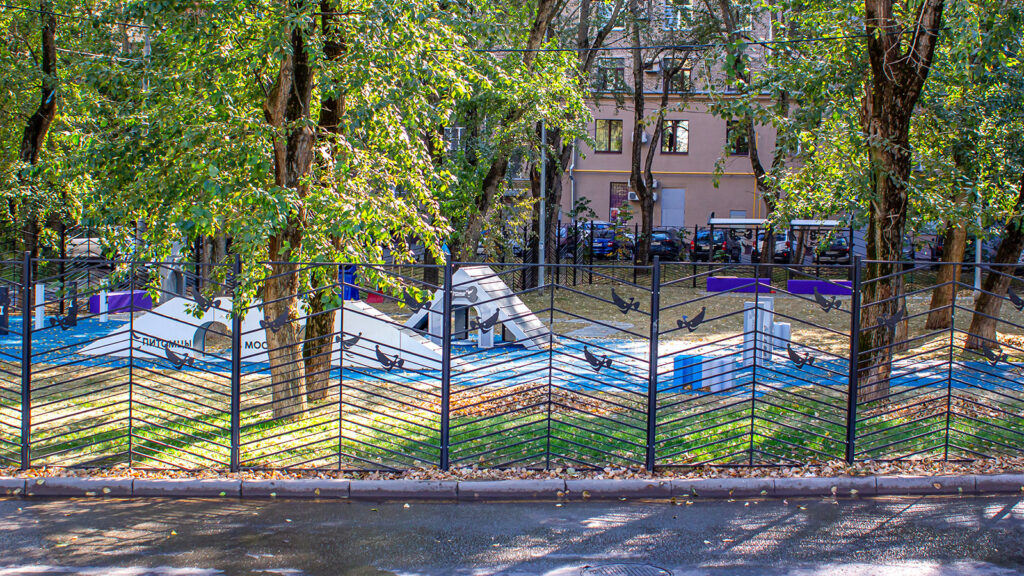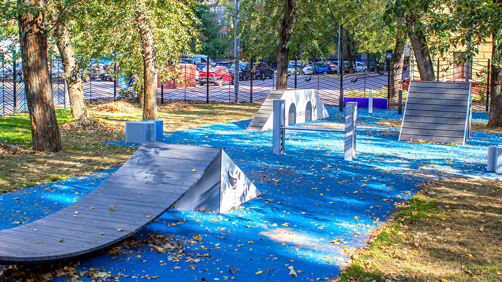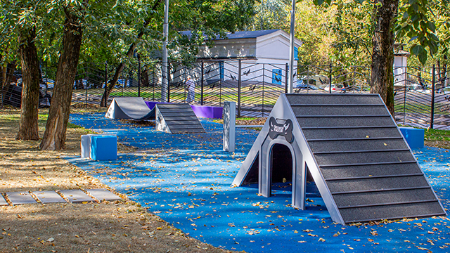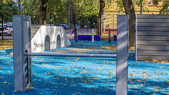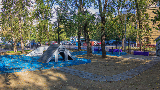 Зона с тренажёрами оборудована нескользящим покрытием из резиновой крошки, а зона для выгула собак имеет травяное покрытие.