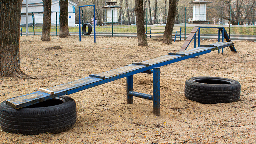 На площадке установлено разное оборудование для тренировки собак: барьер, мостик, слалом, тоннель, бум и наклонная стенка.