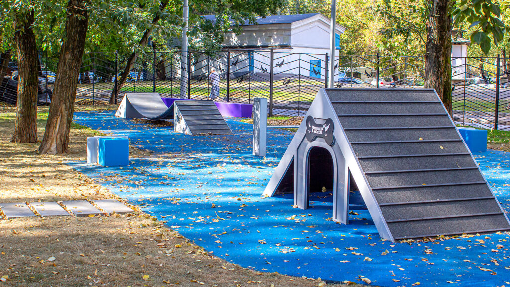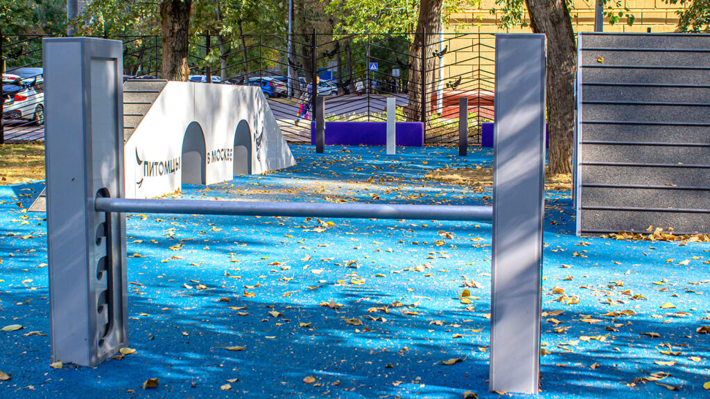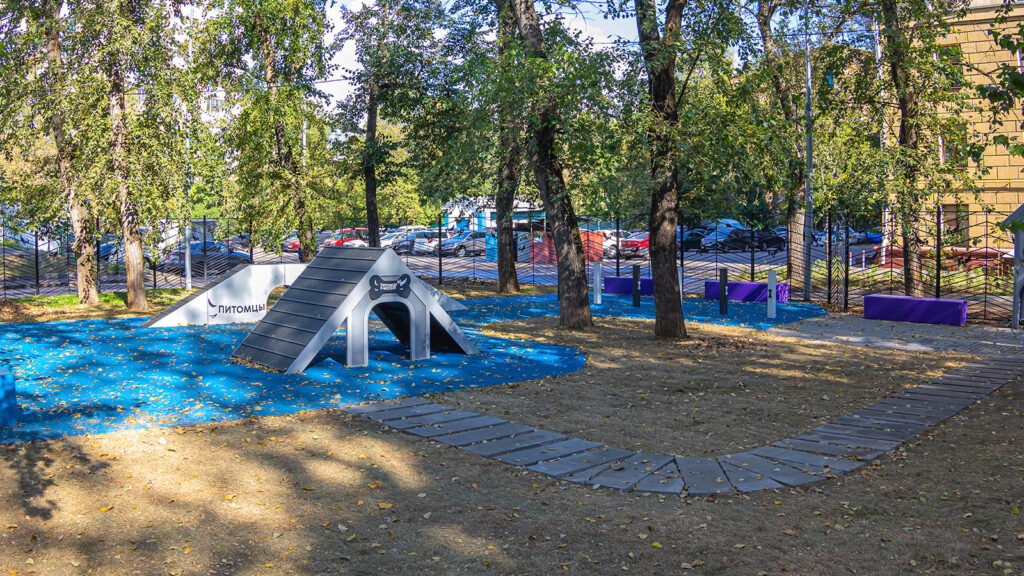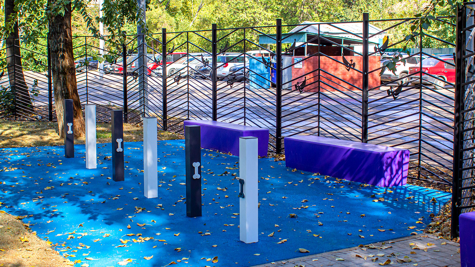 После реконструкции на площадке появились разные снаряды для тренировки собак. На площадке также установлено специальное ограждение.
