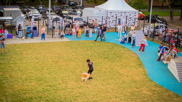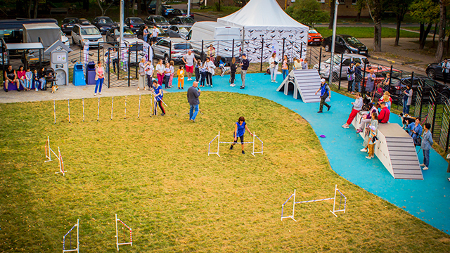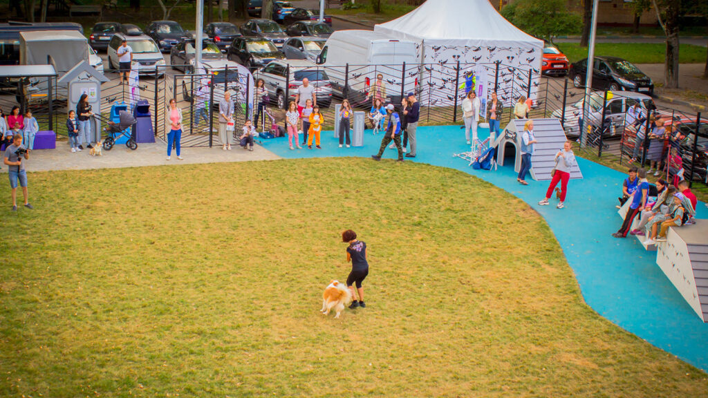 На этом месте уже существовала площадка для выгула собак, которая требовала серьезного обновления. Теперь возведен настоящий комплекс, в котором есть место и для выгула домашних любимцев, и для тренировок, и для отдыха владельцев животных на удобных лавочках под навесом.