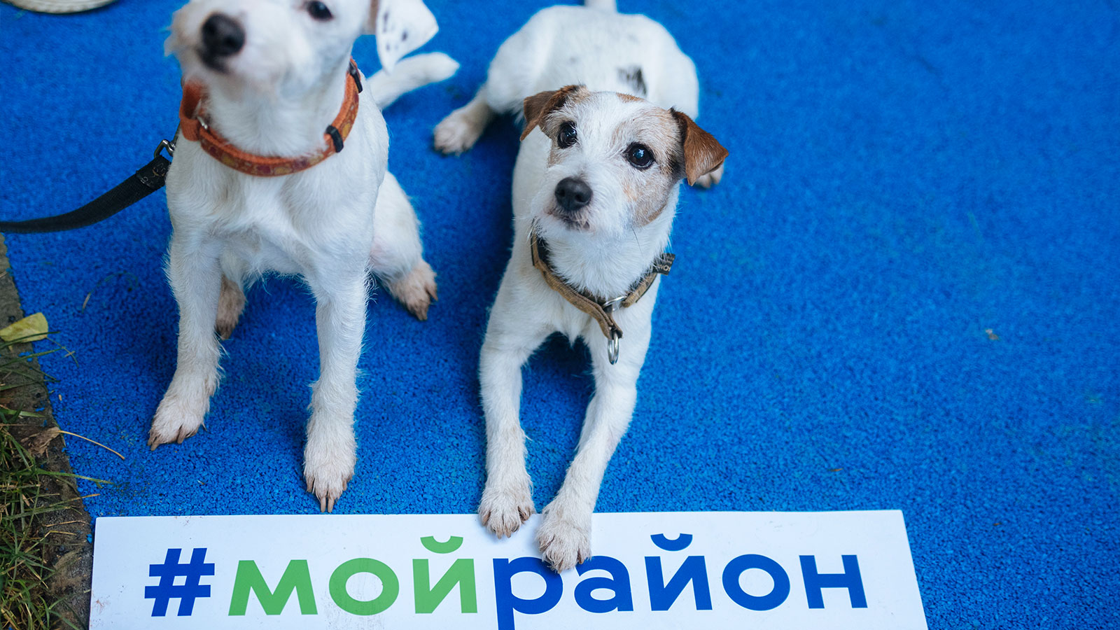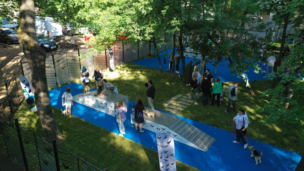 На площадке используется разное покрытие: устойчивое к вытаптыванию травяное покрытие в зоне свободного выгула, нескользящее покрытие из резиновой крошки в тренировочной зоне, на входной группе – бетонная брусчатка, а из тротуарной плитки выполнены дорожки для хозяев.
