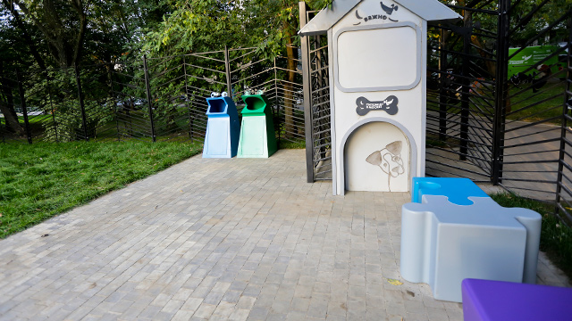 На территории площадки установлены специальные контейнеры для уборки за питомцами и стенд, на котором размещена актуальная информация для хозяев собак.