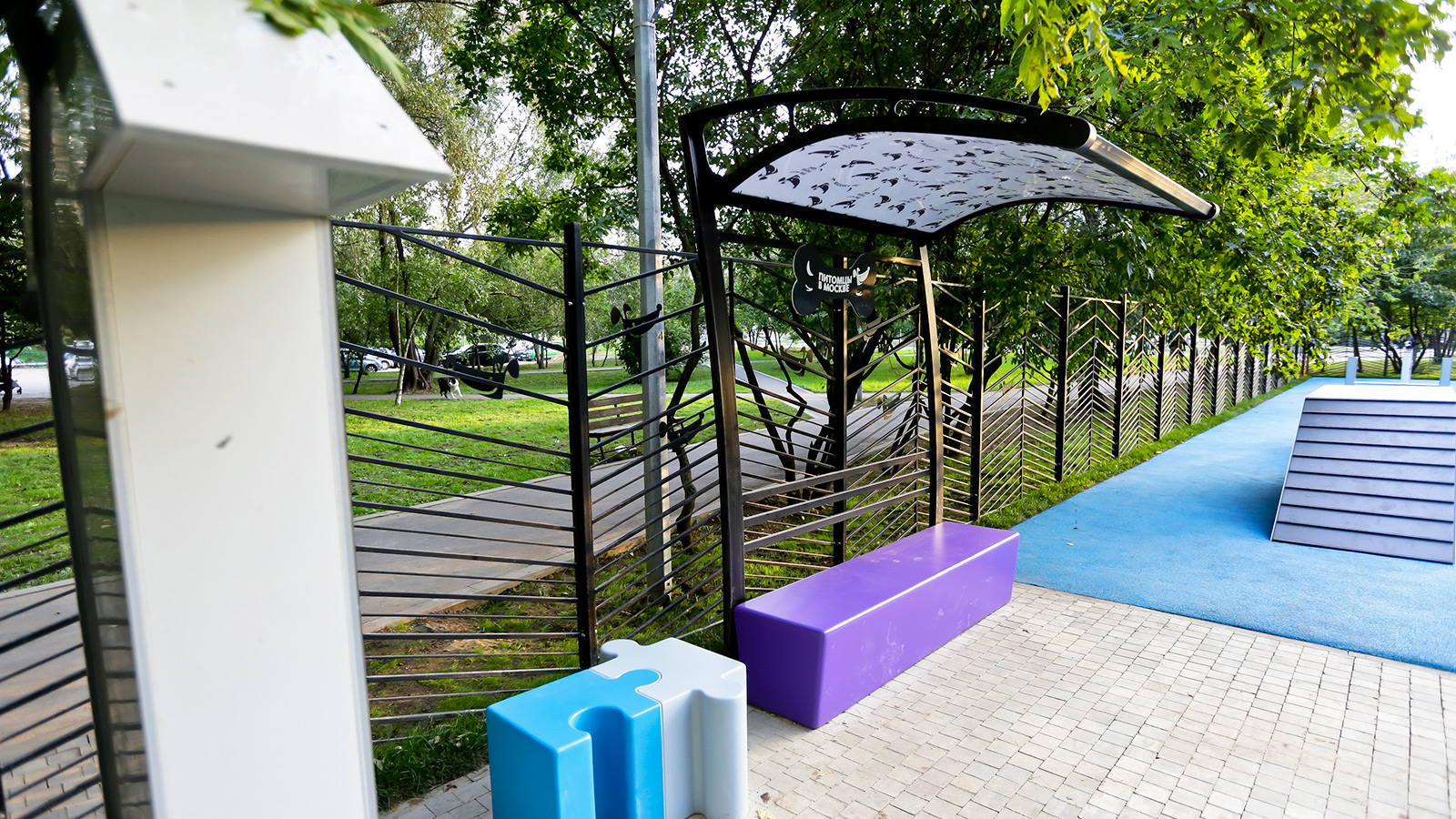 Вход на площадку — через удобную входную группу. На площадке оборудованы места для отдыха и общения хозяев – удобные лавочки и навес от дождя и солнца.