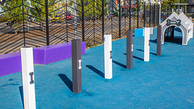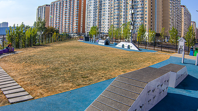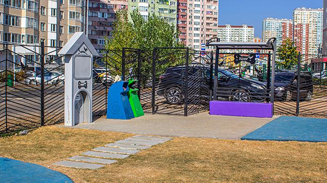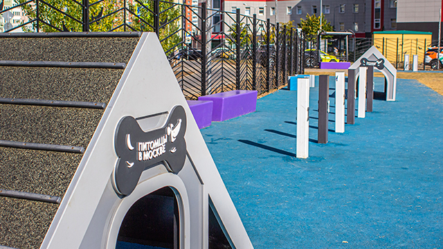 Зона с тренажёрами оборудована нескользящим покрытием из резиновой крошки. Вся территория площадки защищена металлическим ограждением, для хозяев с любимцами оборудовано два входа с магнитами, которые предотвращают побег животного.