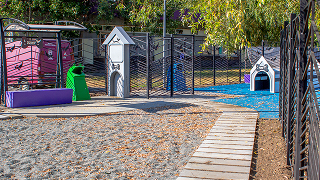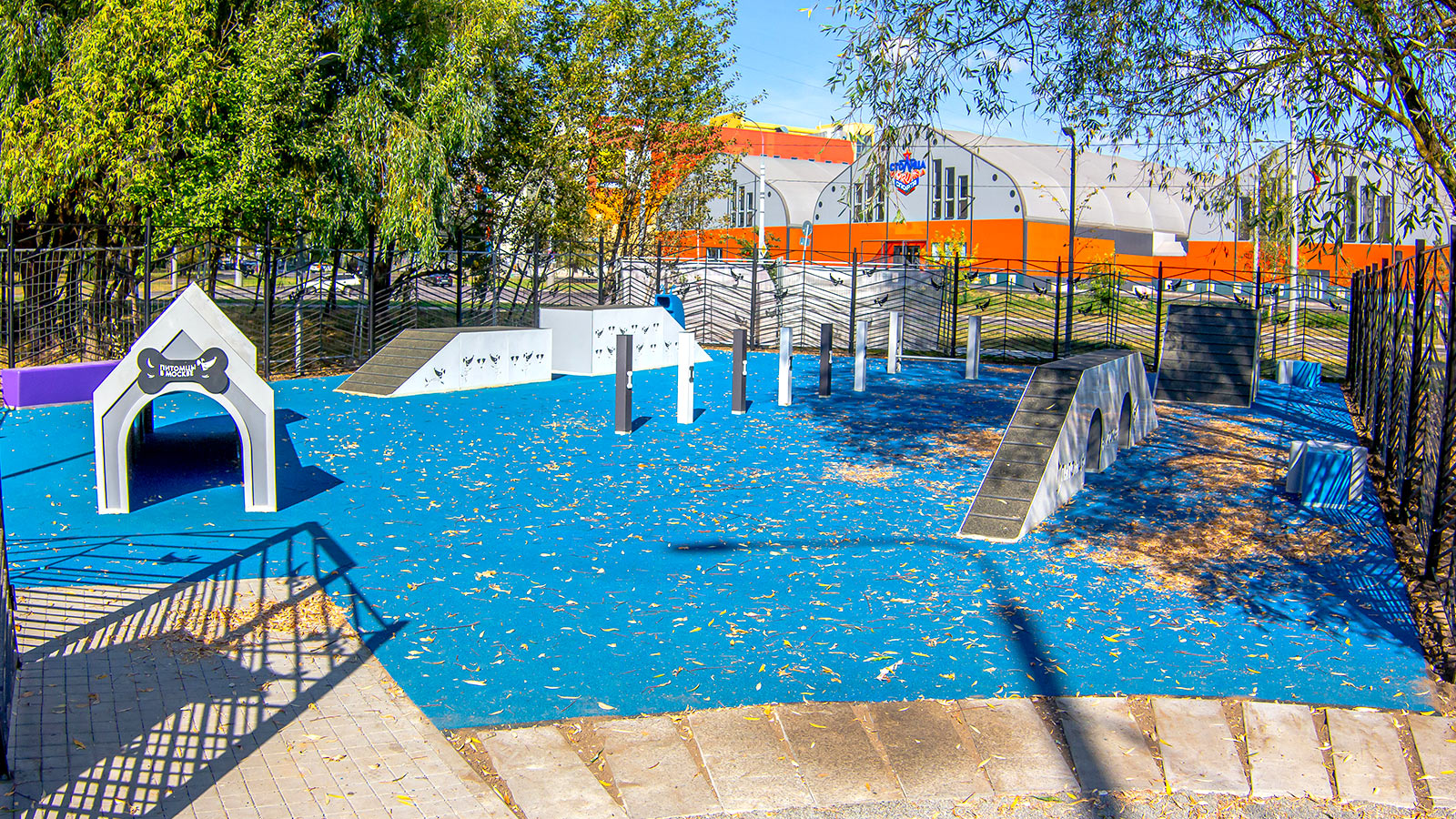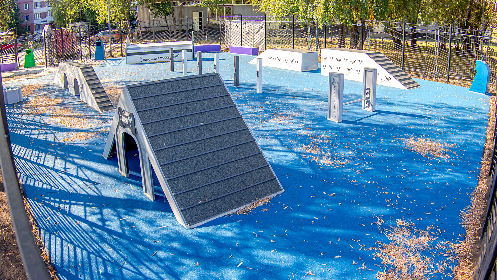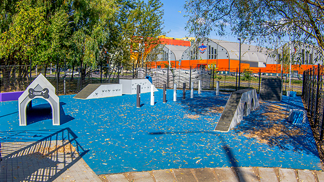 В зоне тренировок установили тренажеры, такие как: слалом, тоннель, барьер-перекладина, окоп, наклонная стенка и бум. Для хозяев обустроили удобные скамейки с навесом от солнца и непогоды.