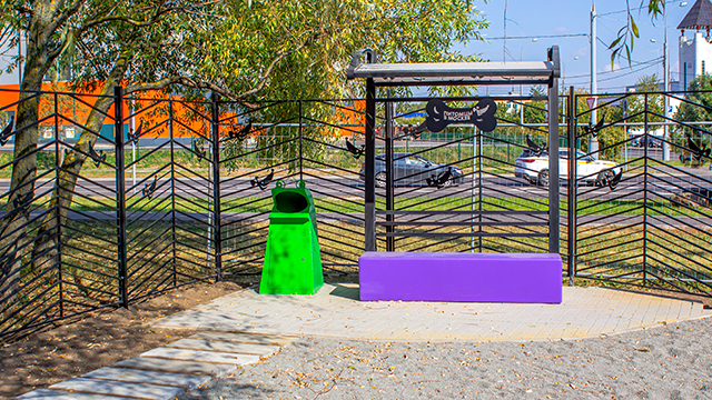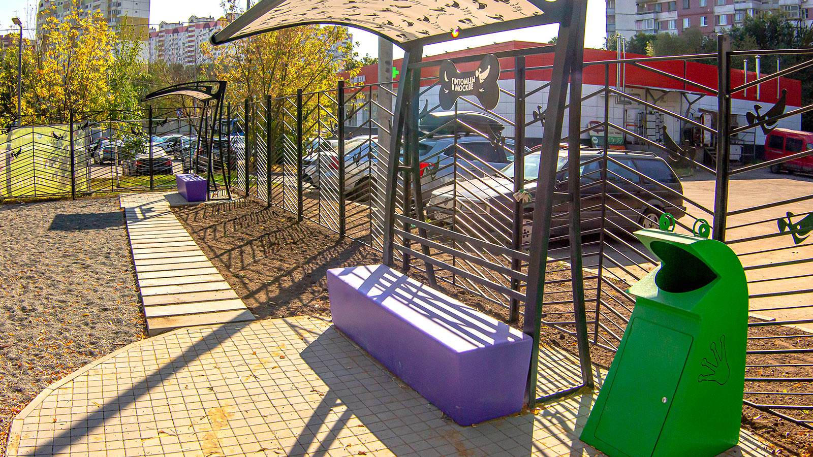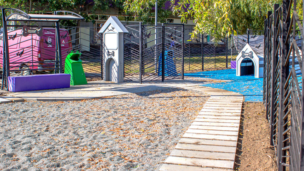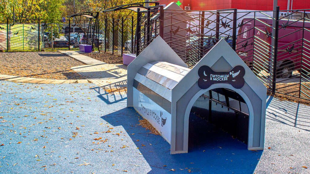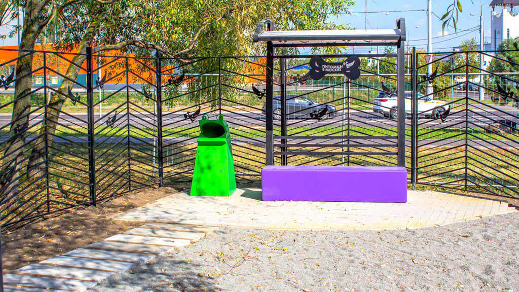 Территория надежно огорожена и освещена, входные ворота оснащены двойными дверями с тамбуром. Для уборки за питомцами установлены контейнеры, а для размещения актуальных новостей — информационный стенд.
