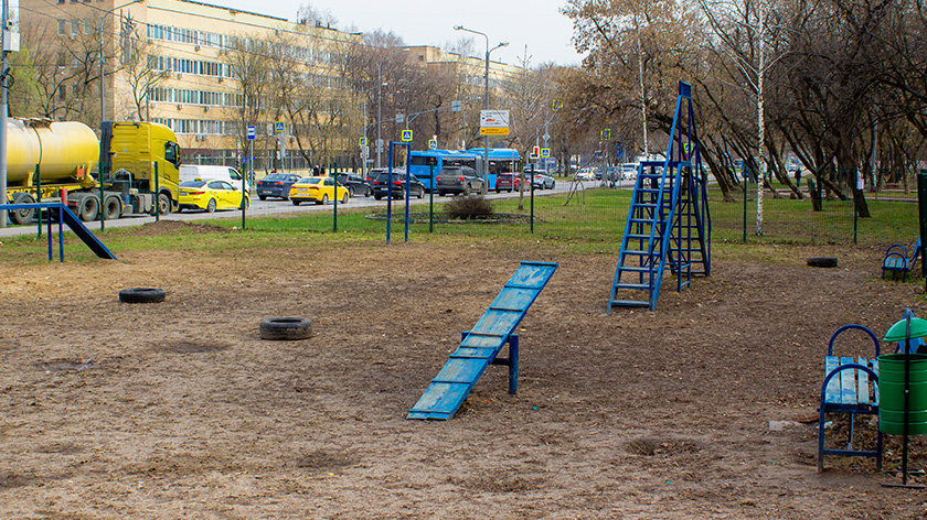 На площадке используется разное покрытие: бетонная брусчатка, специальное амортизирующее резиновое покрытие вокруг тренажеров, а также газон в зоне свободного выгула.