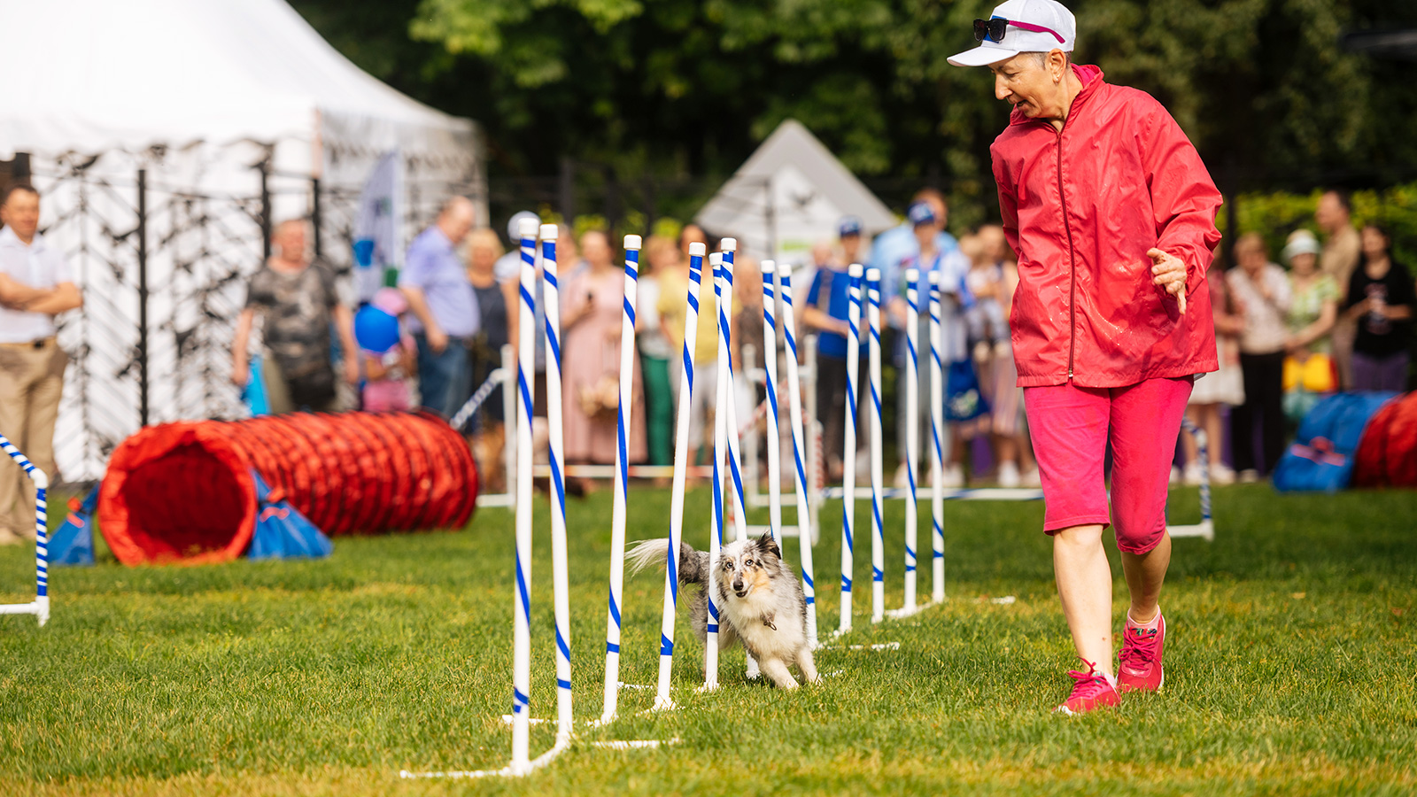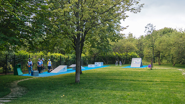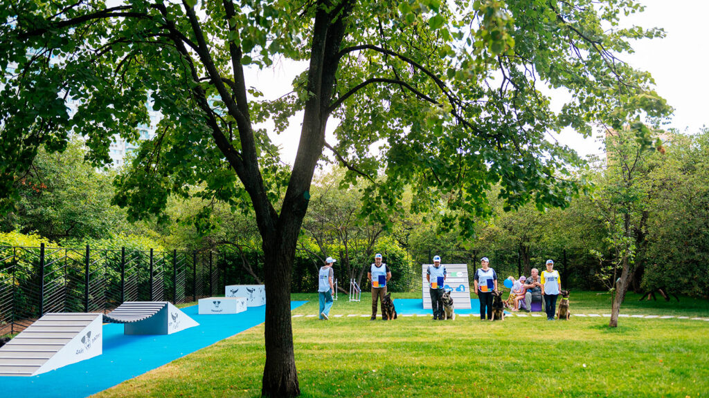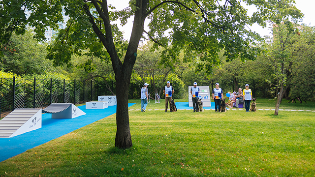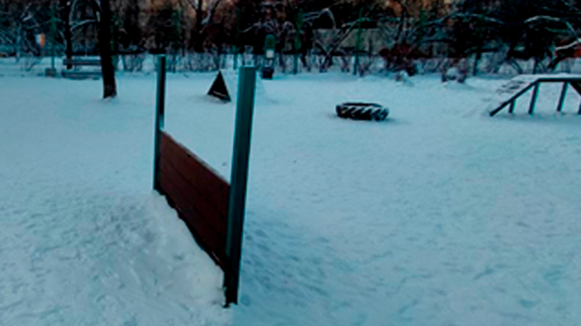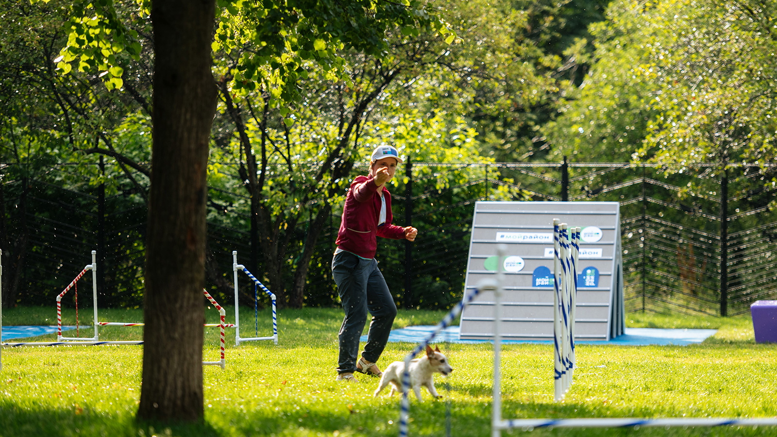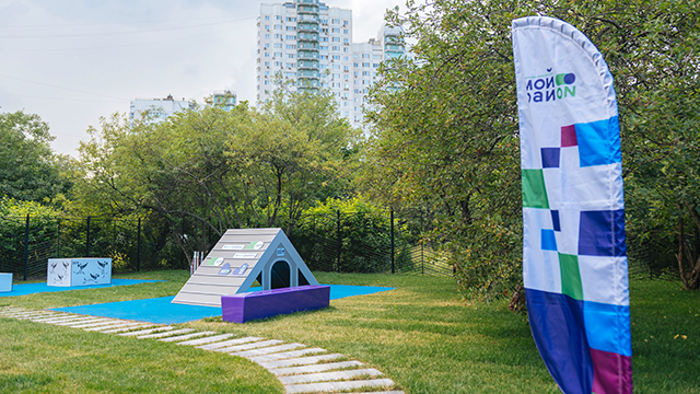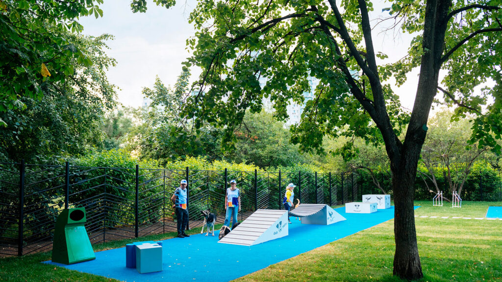 Территория площадки для выгула и дрессировки собак разделена на функциональные зоны: выгульную и тренировочную, на которой установлены несколько видов снарядов для дрессировки, таких как бум, барьер, мостик. Для владельцев собак организована зона отдыха под навесом.