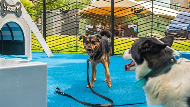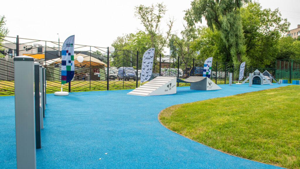 На площадке используется разное покрытие: устойчивое к вытаптыванию травяное покрытие в зоне свободного выгула, нескользящее покрытие из резиновой крошки в тренировочной зоне, на входной группе – бетонная брусчатка, а из тротуарной плитки выполнены дорожки для хозяев.