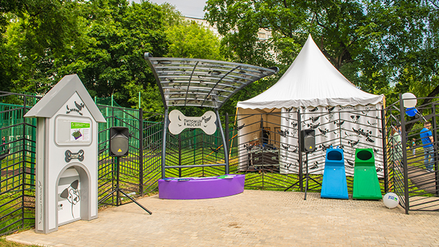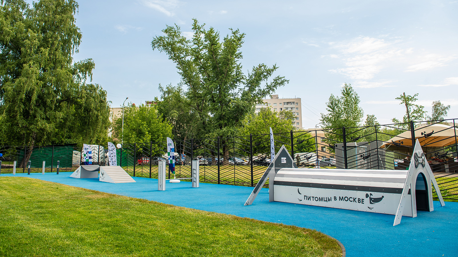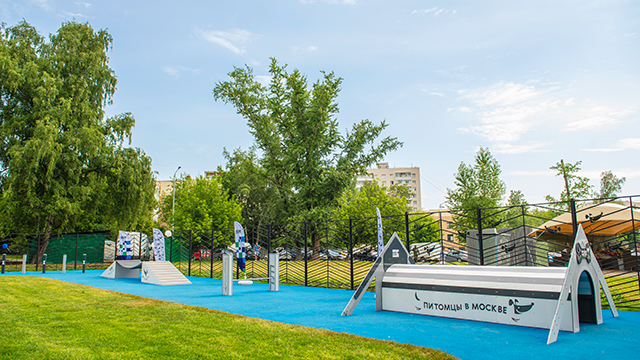 Территория площадки разделена на функциональные зоны: зону свободного выгула и тренировочную. На площадке установлено несколько видов снарядов для дрессировки, таких, как бум, барьер, мостик. Для владельцев собак организована зона отдыха под навесом.
