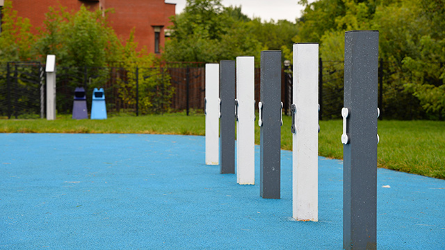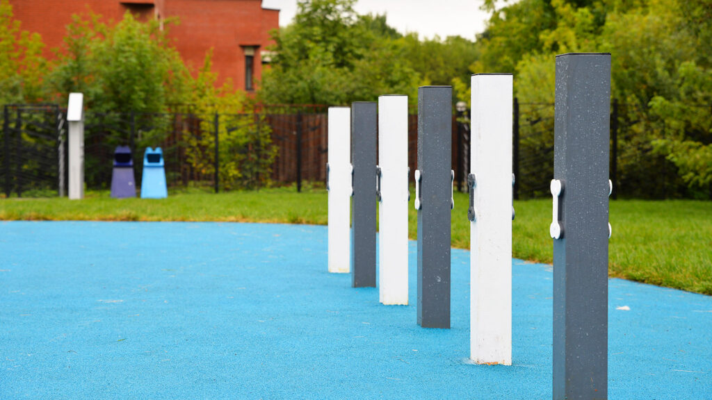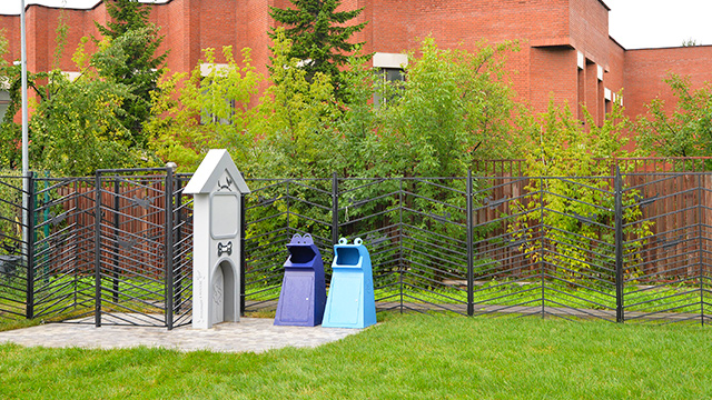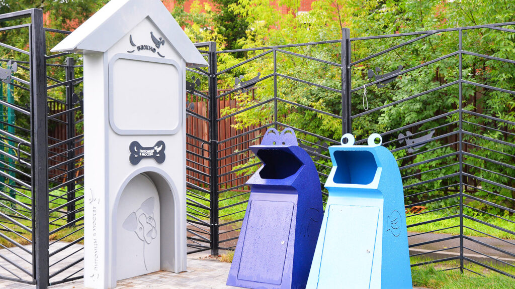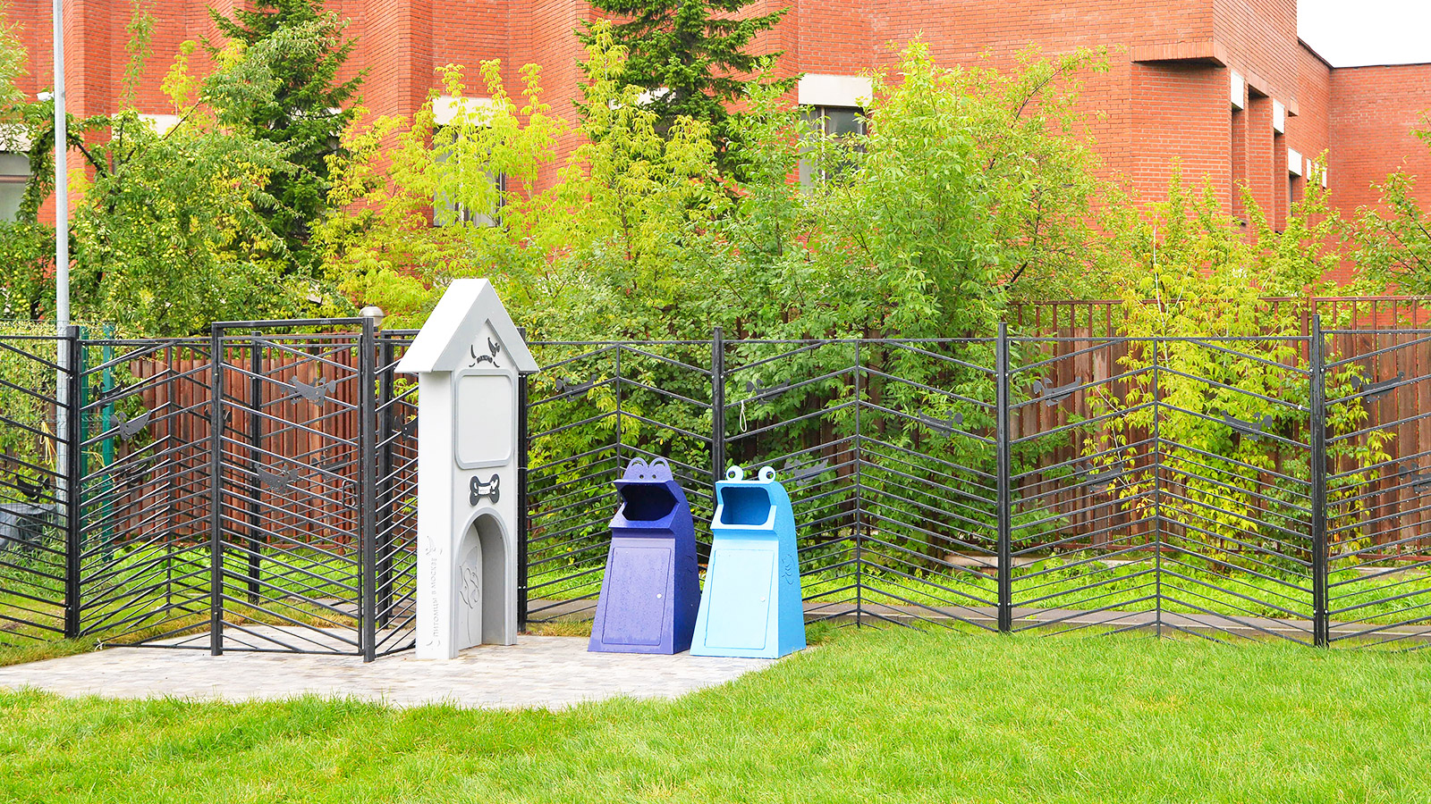 Установлены два входа-тамбура с двойными воротами, которые предотвращают случайный выход собаки за пределы ограждённой территории. Есть специальные контейнеры для уборки за питомцами и информационные стенды, где будет размещаться актуальная информация для владельцев собак.