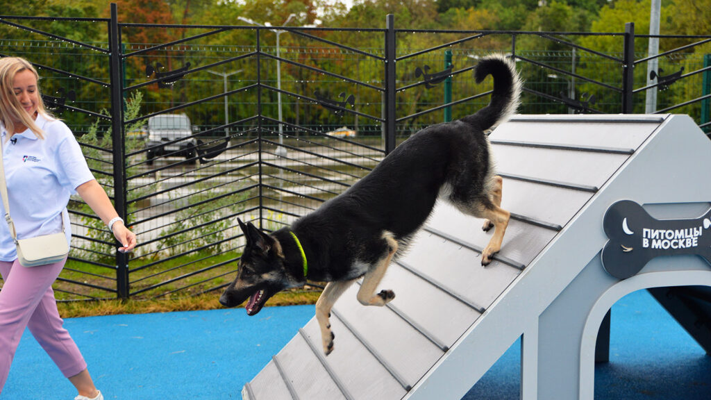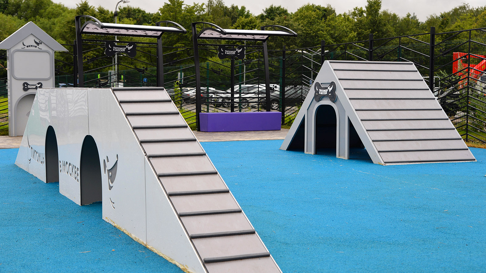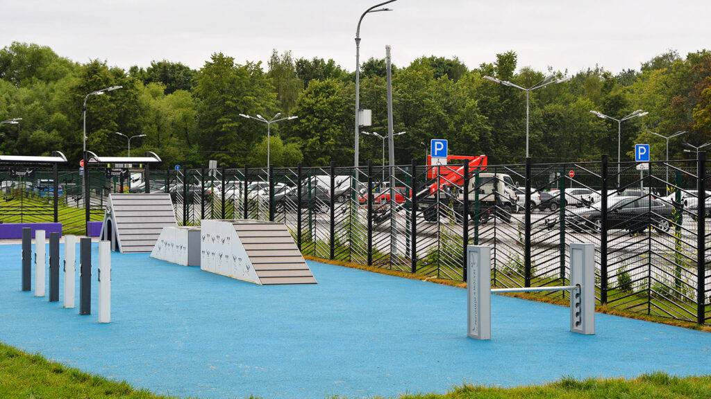 В дрессировочной зоне установлены различные снаряды для тренировок: слалом, наклонная стенка, барьер, бум и окоп. Для владельцев собак организована зона отдыха под навесом.