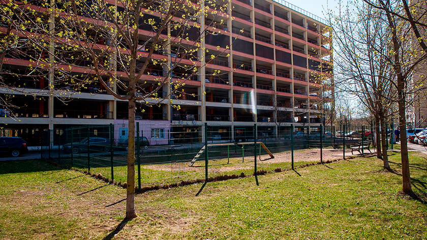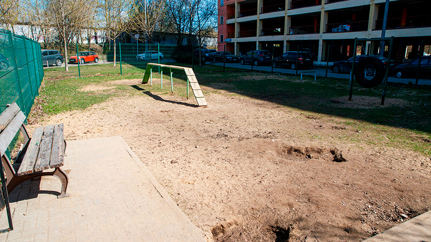 На площадке используется разное покрытие: рулонный газон, бетонная брусчатка и тротуарная плитка, а также нескользящее покрытие из резиновой крошки в зоне для тренировок.