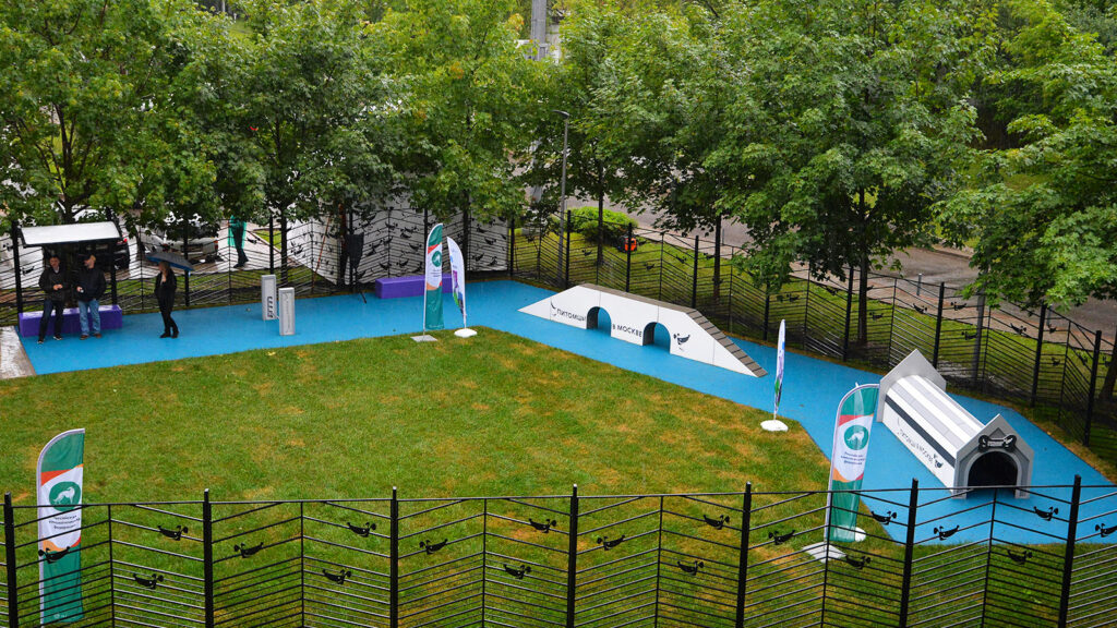 В пространстве, предназначенном для свободного выгула, уложен газон, чтобы собакам было комфортно бегать.