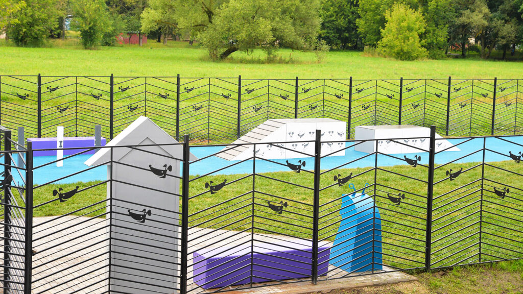 В дрессировочной зоне площадка оборудована специальными снарядами: слалом, окоп, бум, барьер, тоннель. Также устроена зона отдыха под навесом для владельцев собак.
