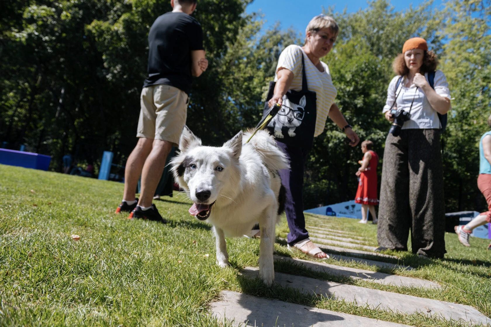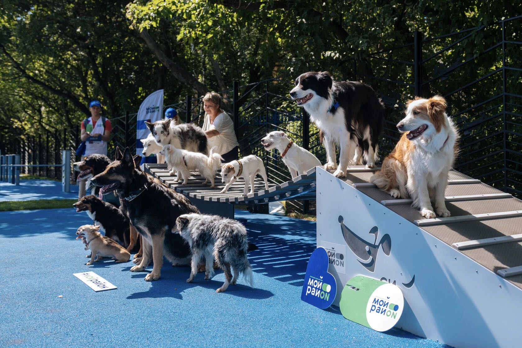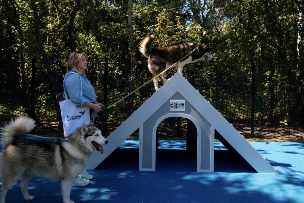 Здесь есть зоны для тренировок и свободного выгула. Тренажер слалом развивает координацию движений питомца, а тренировочный мостик учит преодолевать препятствия по безопорной поверхности. Для хозяев установлена скамья с навесом, где они могут отдохнуть и пообщаться друг с другом.