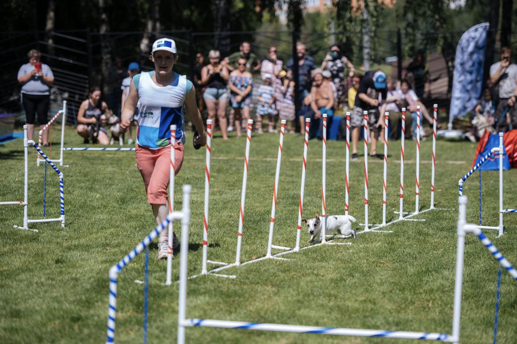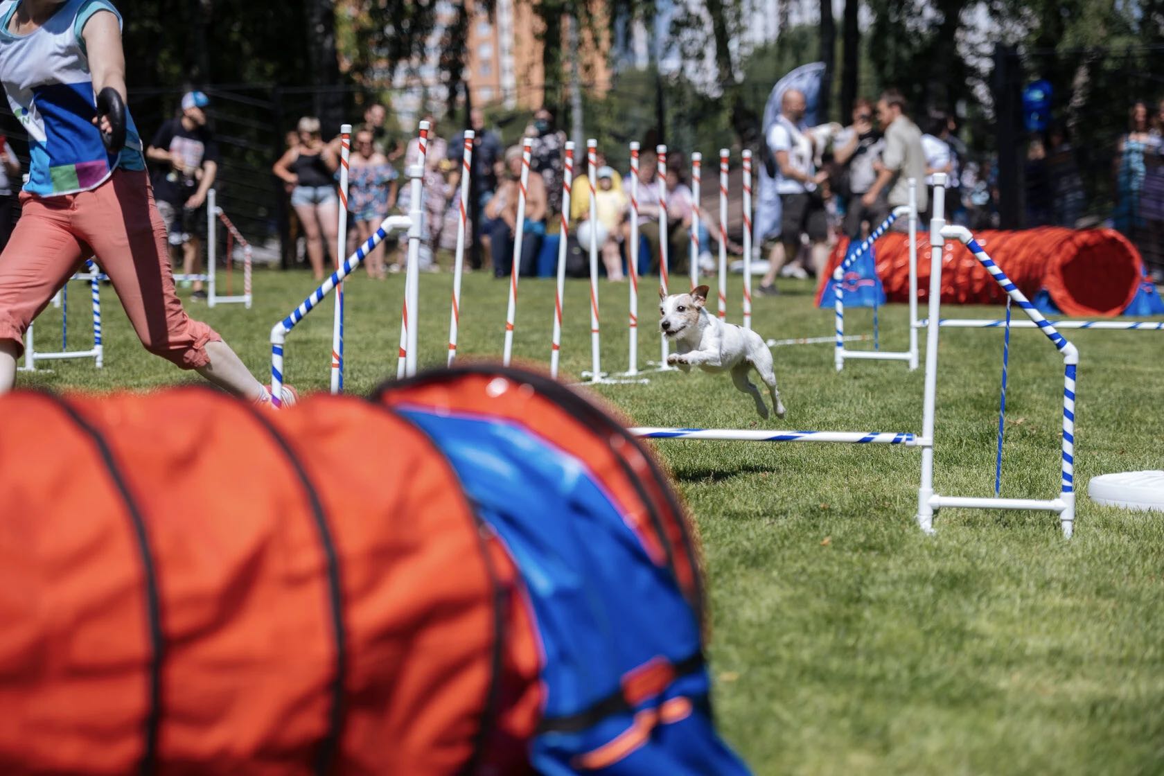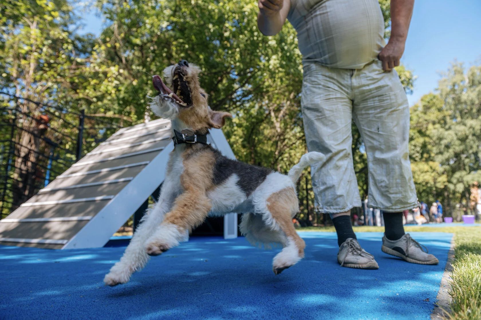 Здесь есть зоны для тренировок и свободного выгула. Тренажер слалом развивает координацию движений питомца, а тренировочный мостик учит преодолевать препятствия по безопорной поверхности. Для хозяев установлена скамья с навесом, где они могут отдохнуть и пообщаться друг с другом.