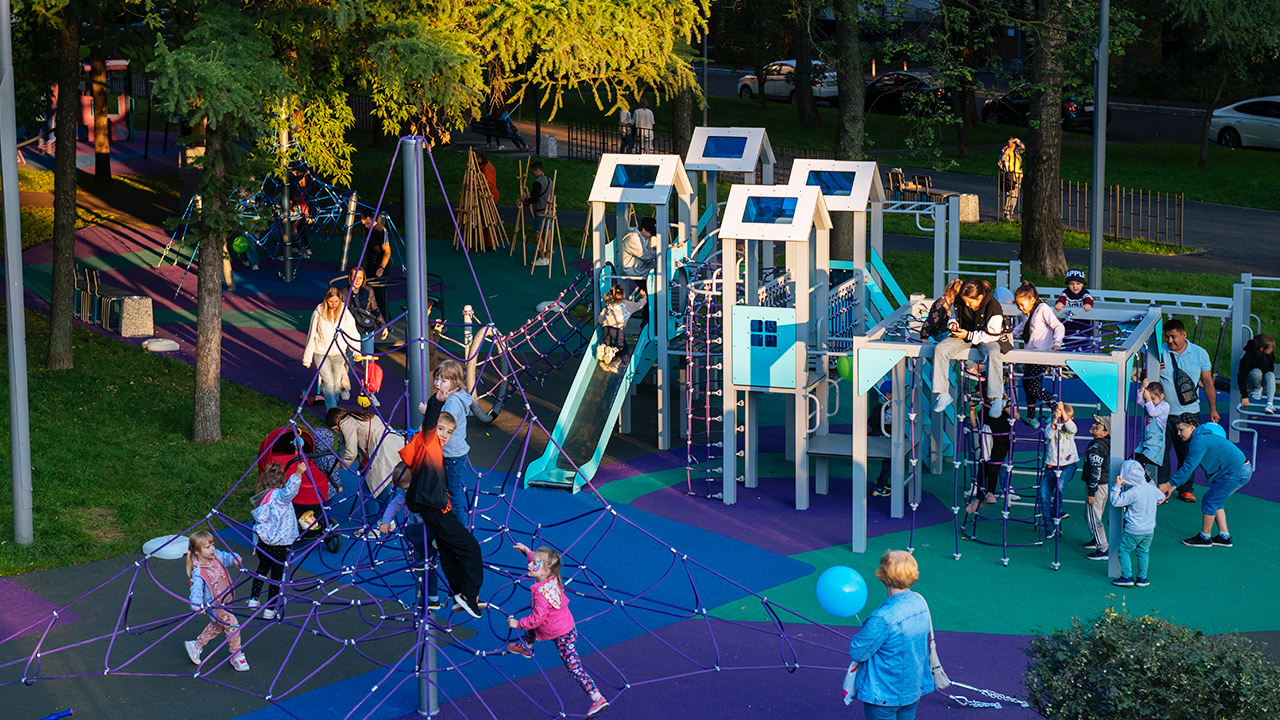 Детскую территорию оформили в ярких цветах. По просьбам жителей здесь разместили городок с канатным комплексом, каруселями и качелями.