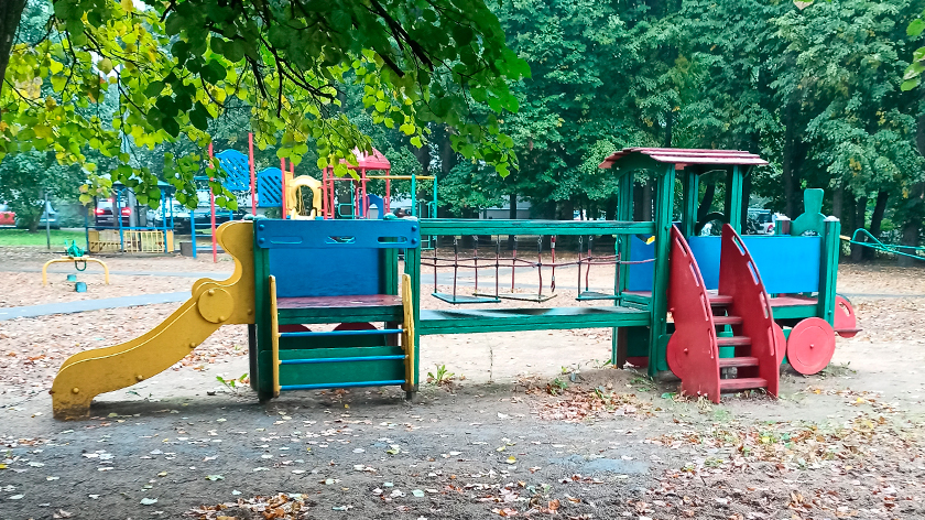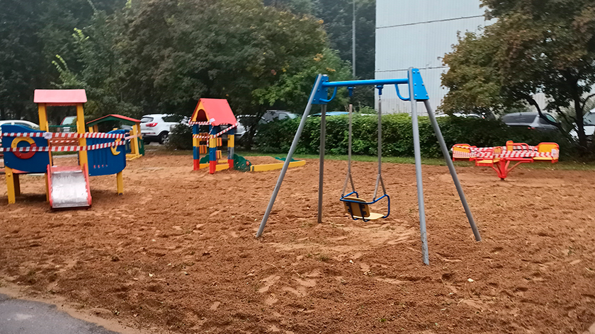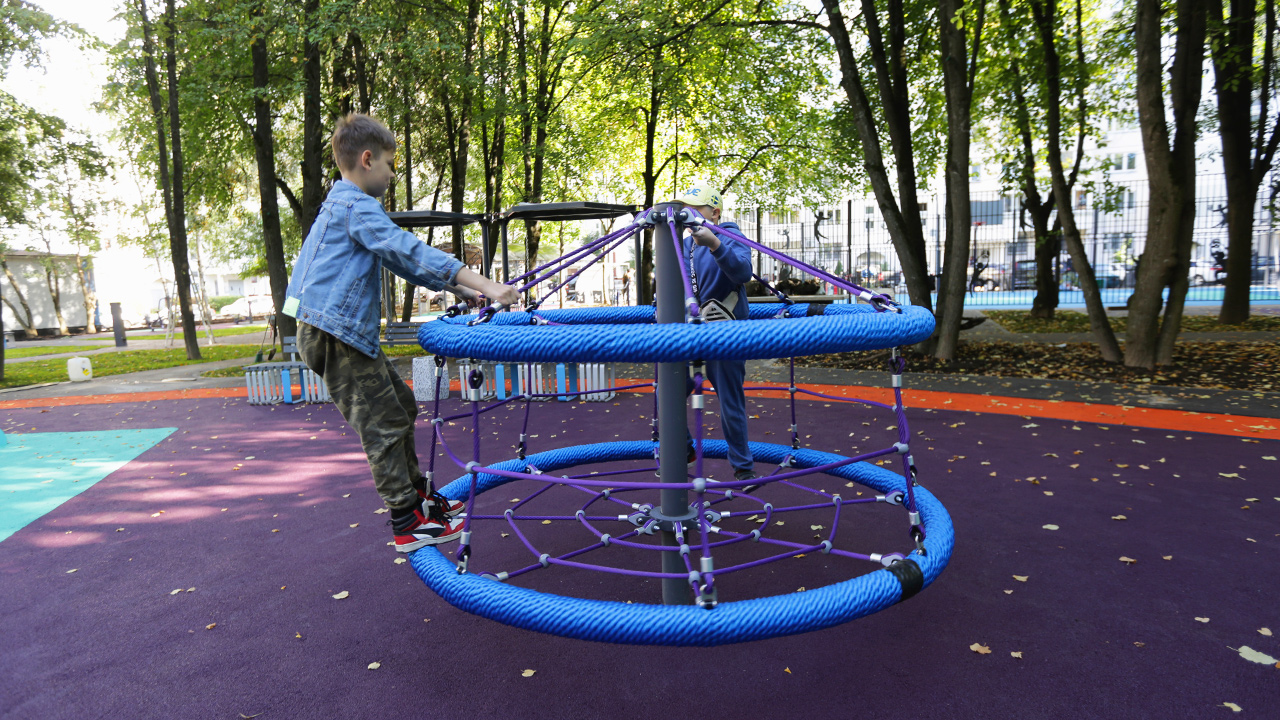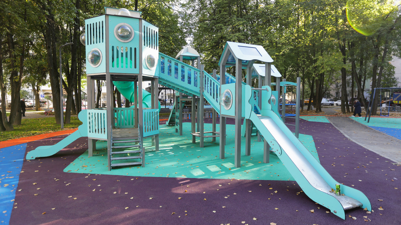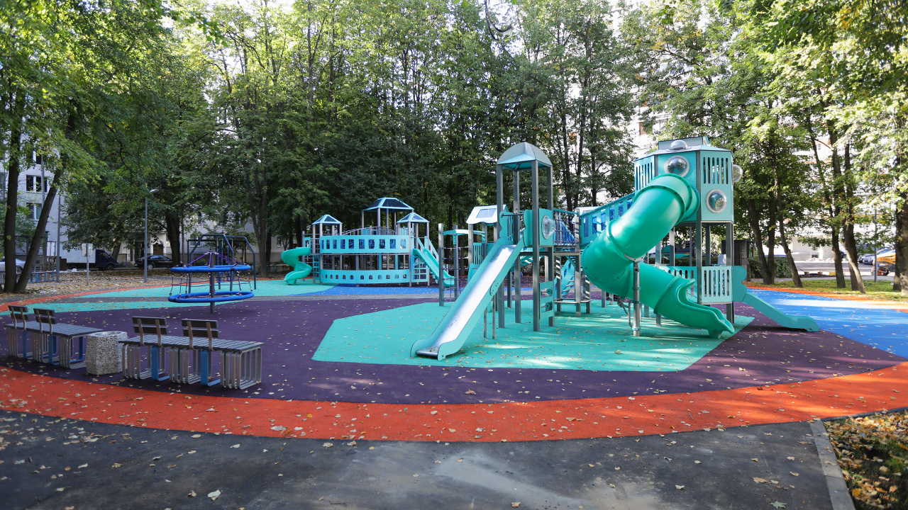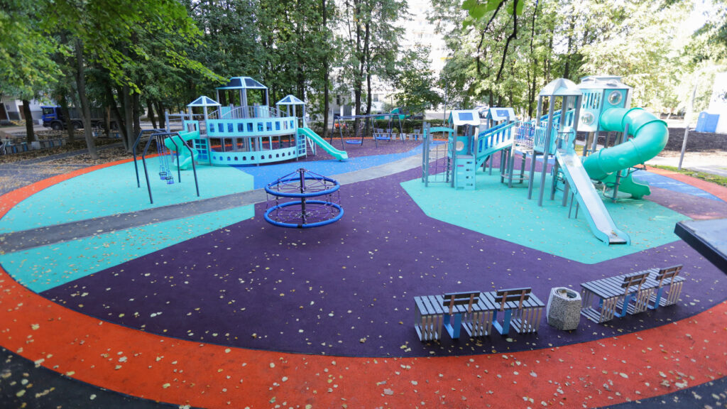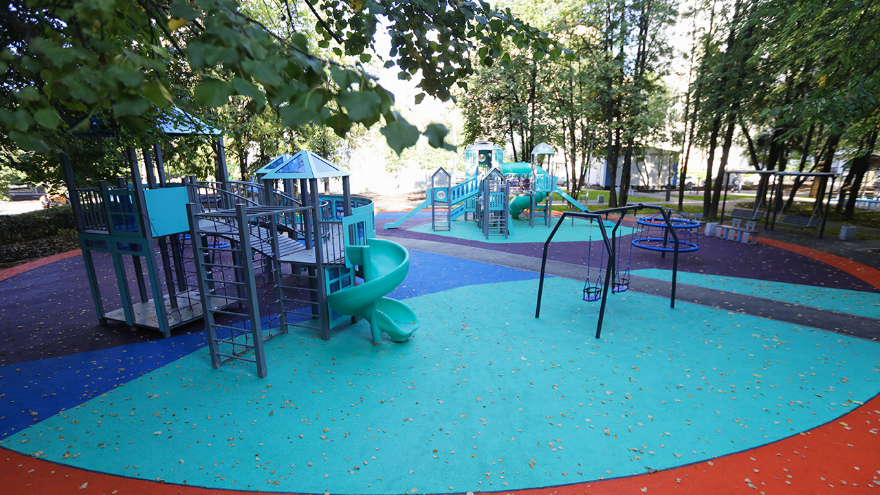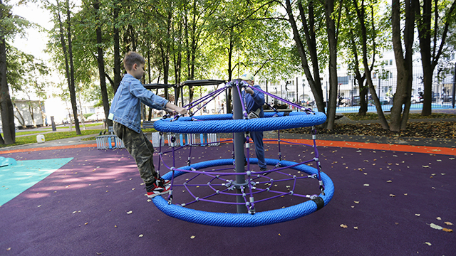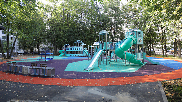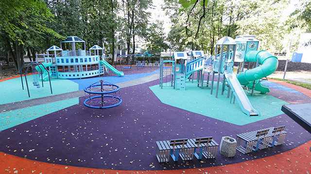 На территории созданы независимые игровые зоны для детей разного возраста. Вокруг большой площадки для детей от 7 до 13 лет проложена велодорожка. Площадка оснащена игровыми комплексами, качелями и каруселями. На площадке для малышей – игровой комплекс с песочницей, качалки, балансир.