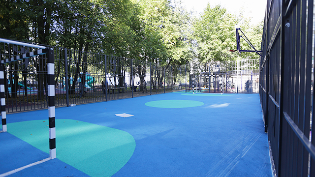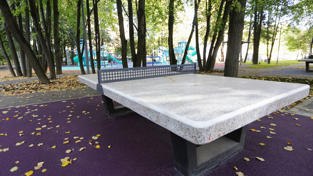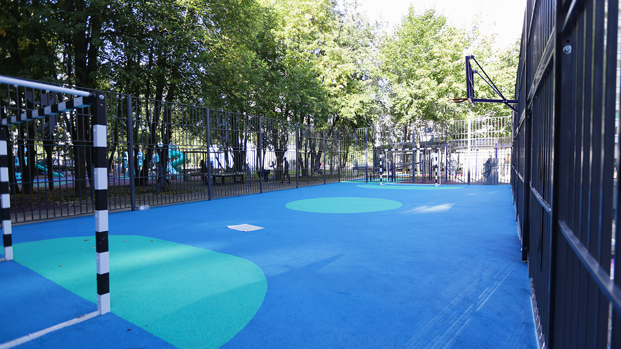 Обустроена большая спортивная зона: обновлена универсальная спортивная площадка, организована площадка с тренажерами и теннисными столами.