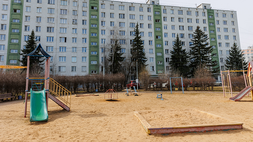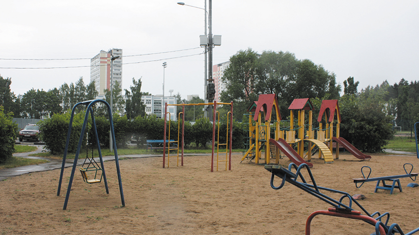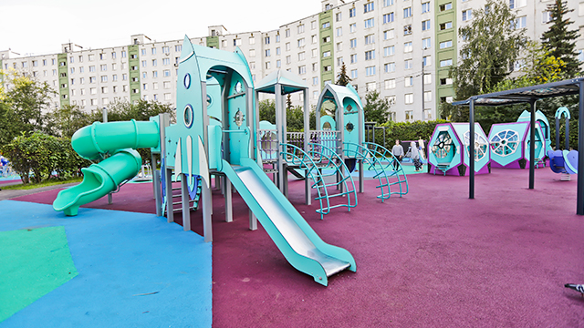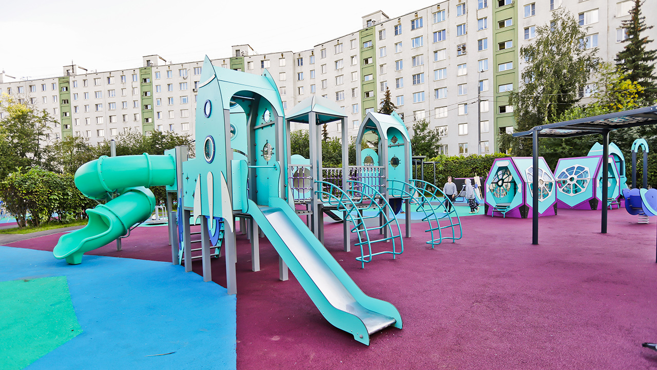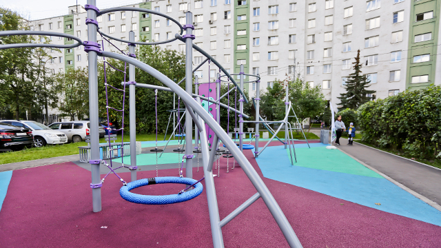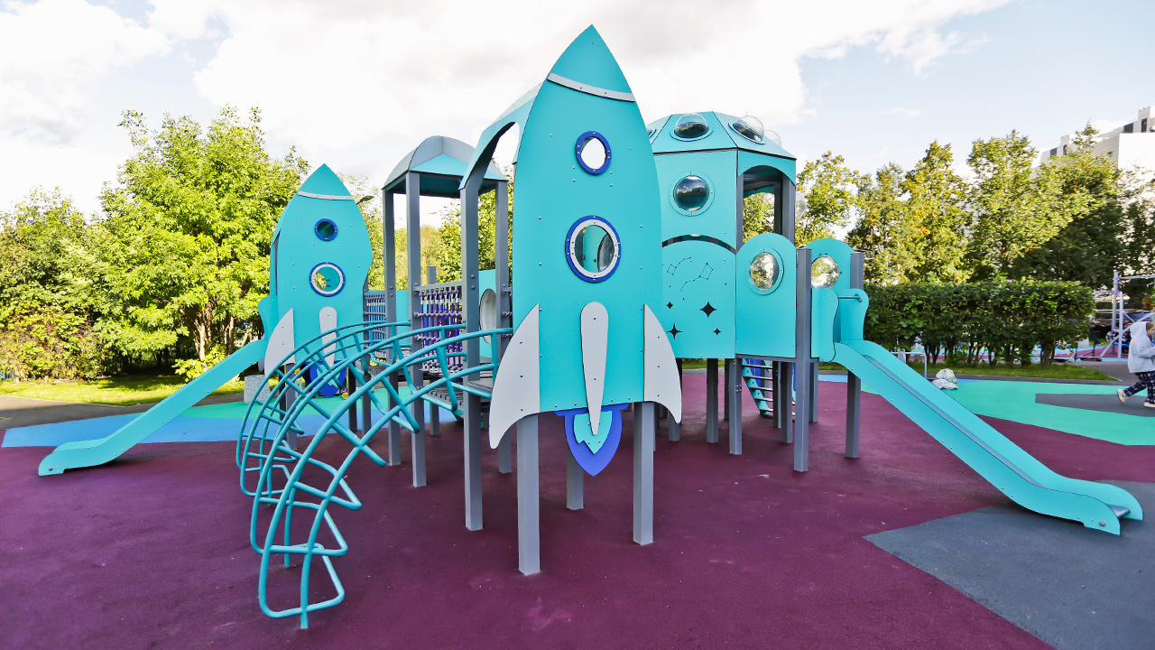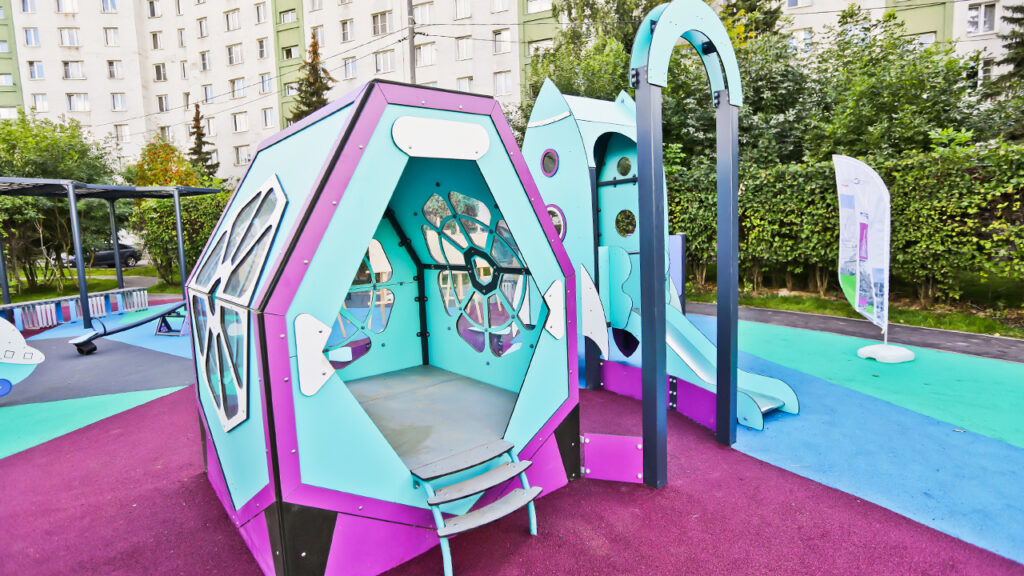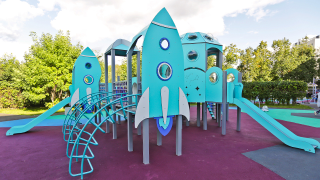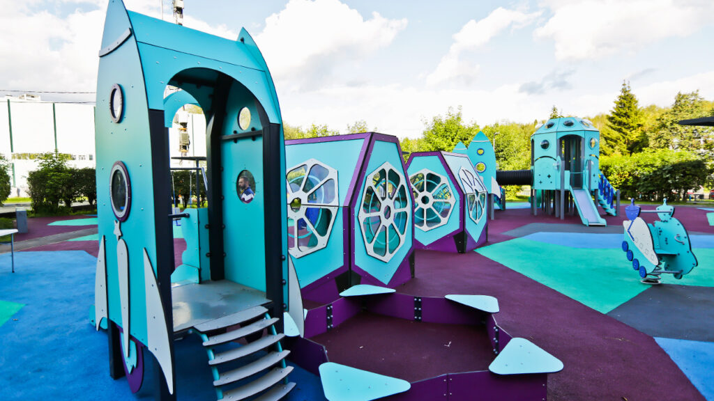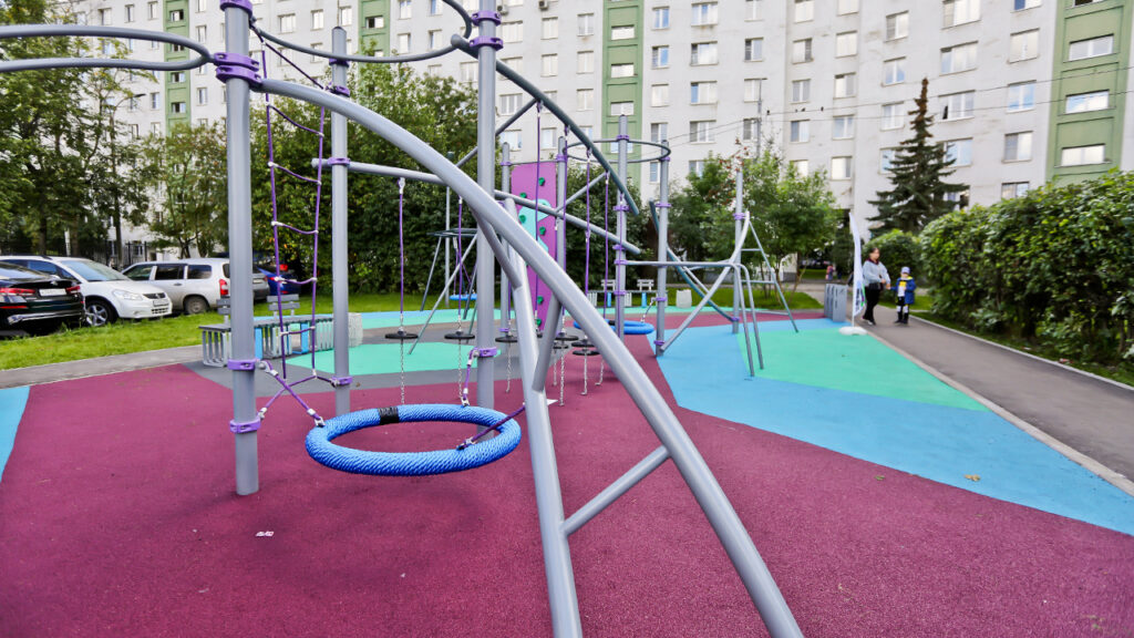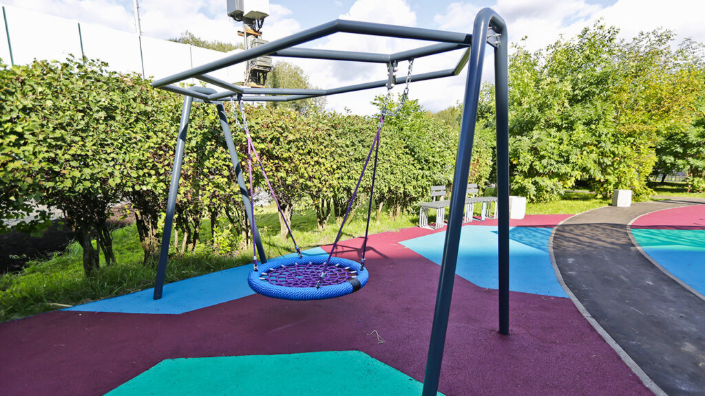 Детская площадка оснащена игровыми комплексами, качелями, канатными конструкциями, батутом, песочницей.