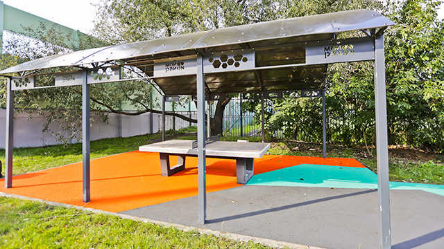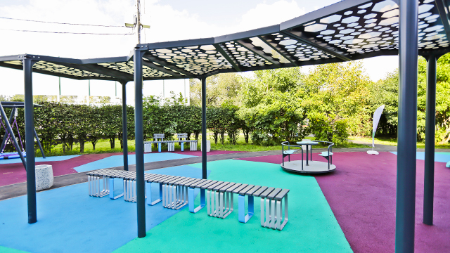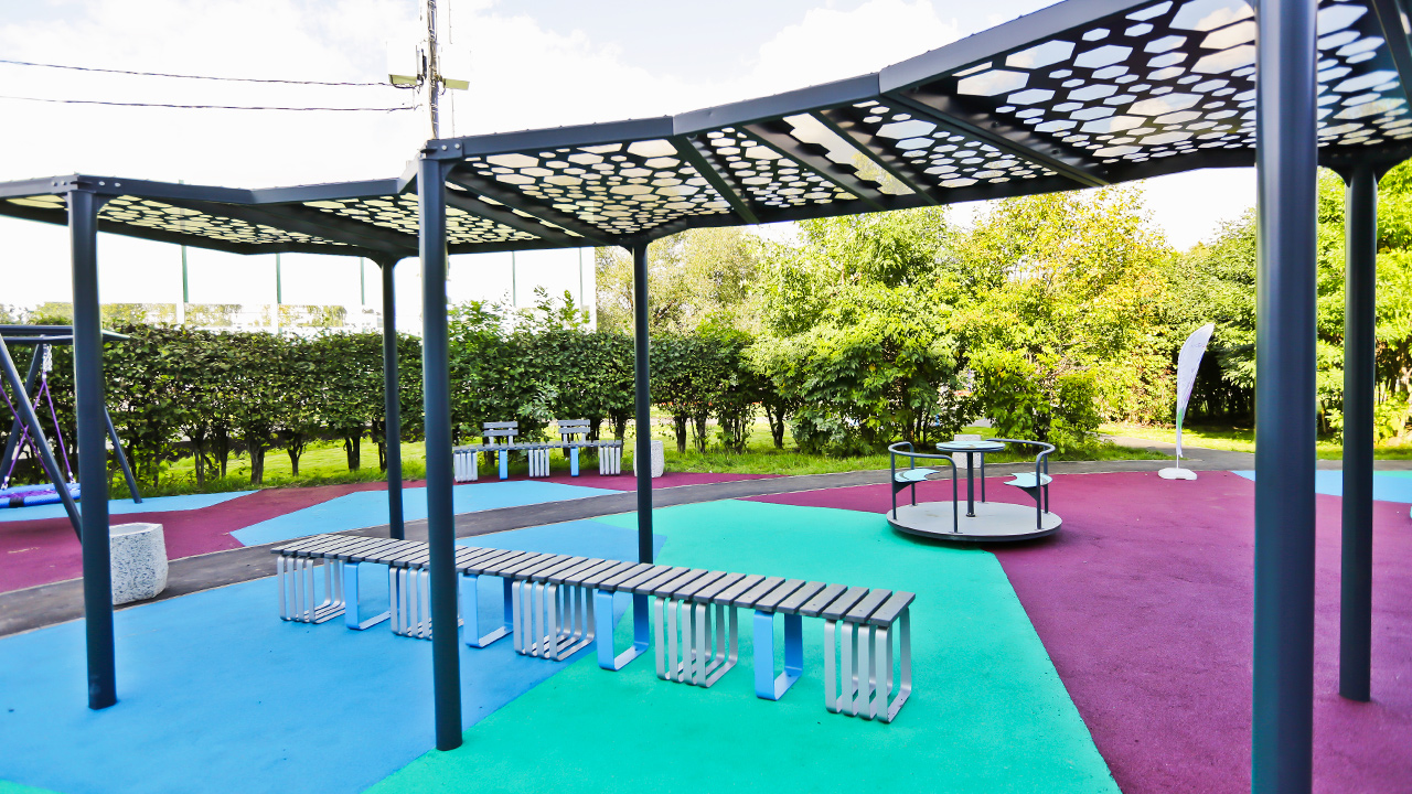 Вокруг игровых площадок проложена детская велодорожка, а между ними устроена зона отдыха с навесом-перголой для родителей. Отсюда удобно присматривать за детьми, играющими на разных площадках.