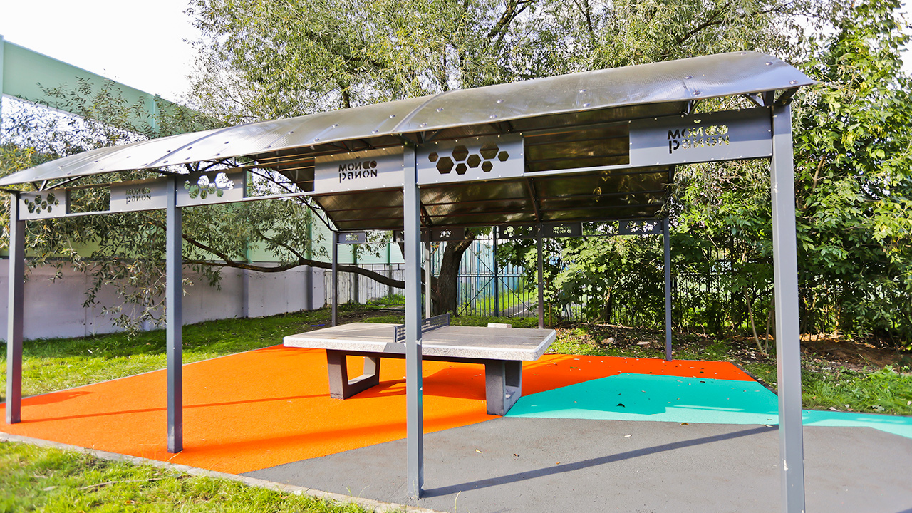 Для активных жителей обустроена спортивная зона с тренажёрами и площадки для игры в настольный теннис.
