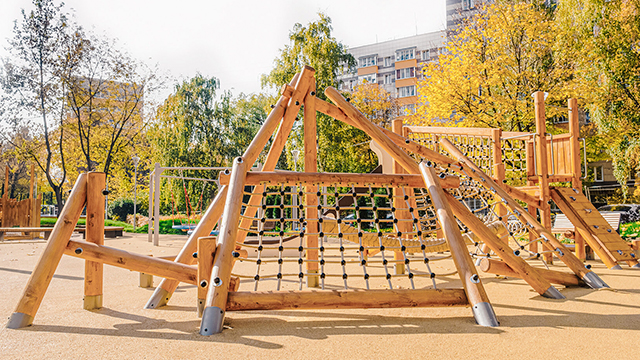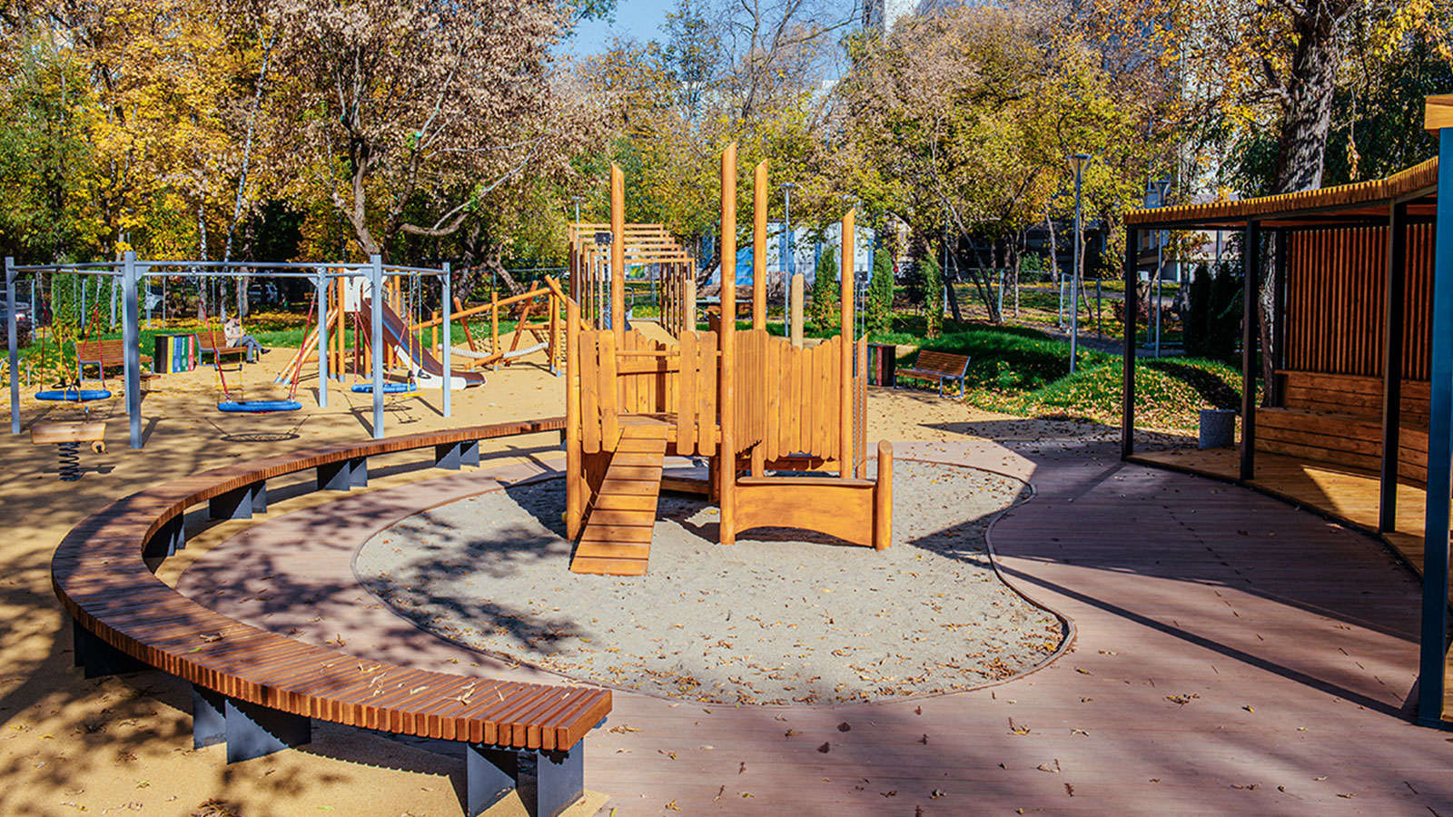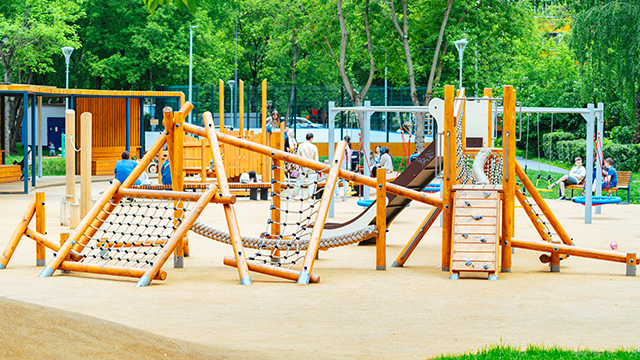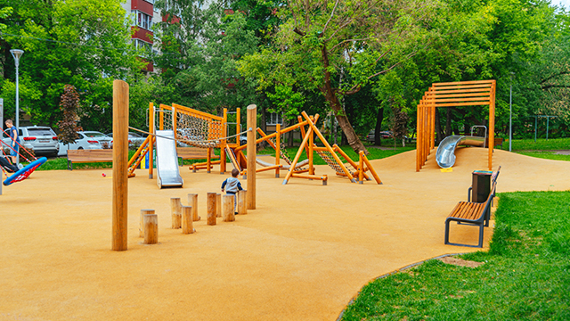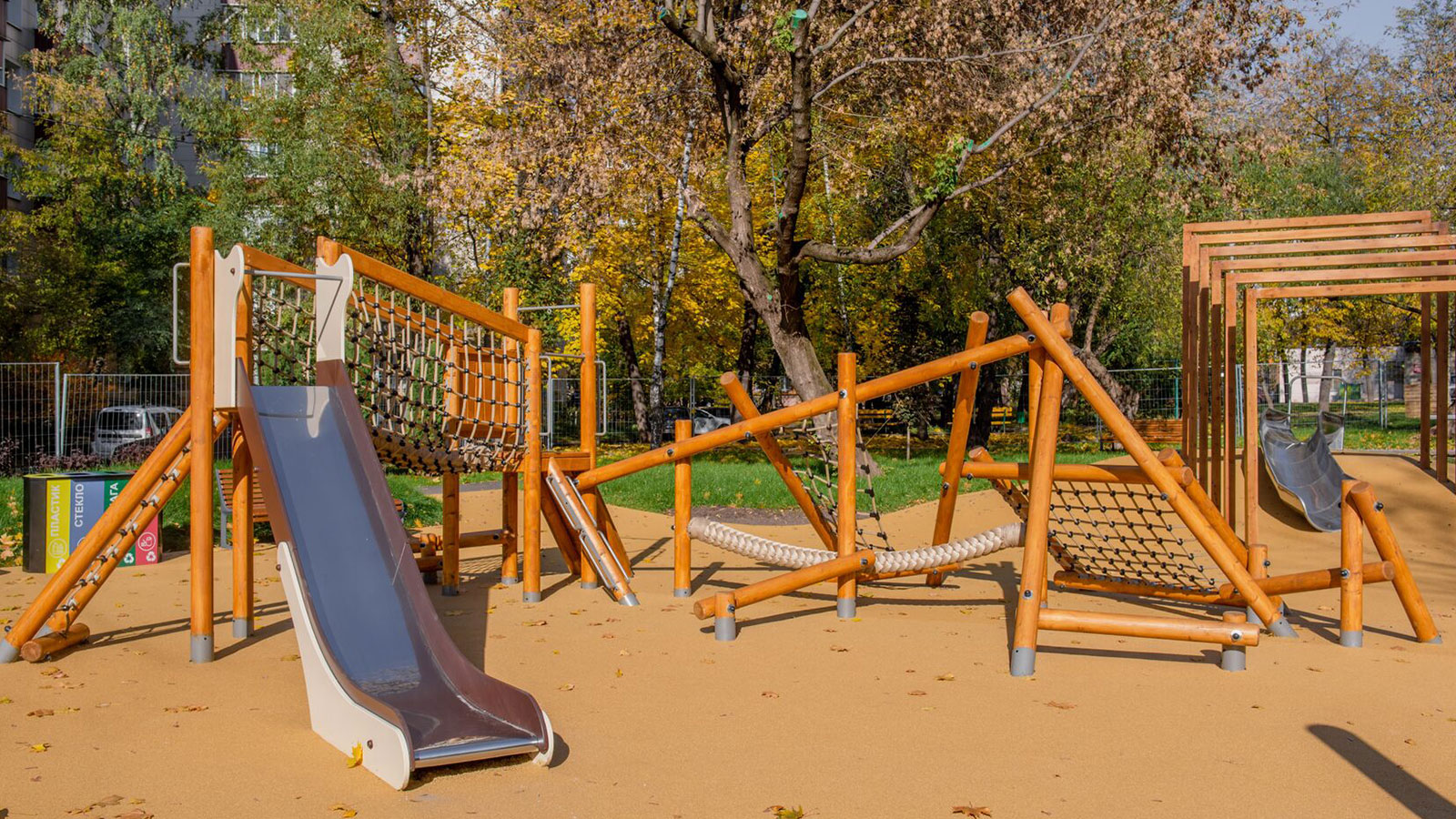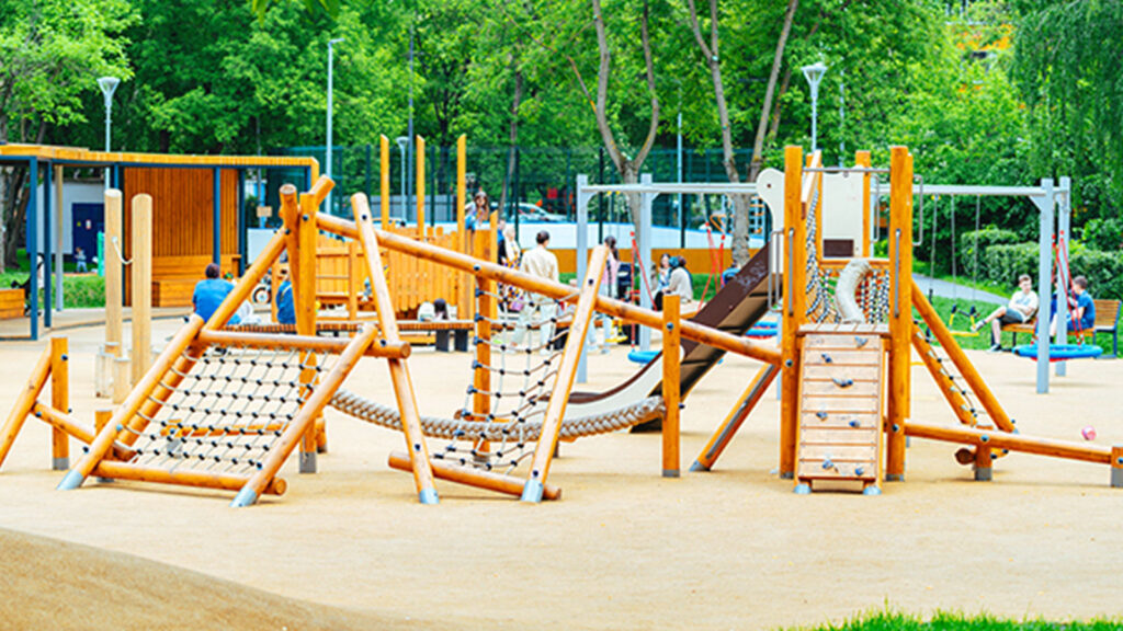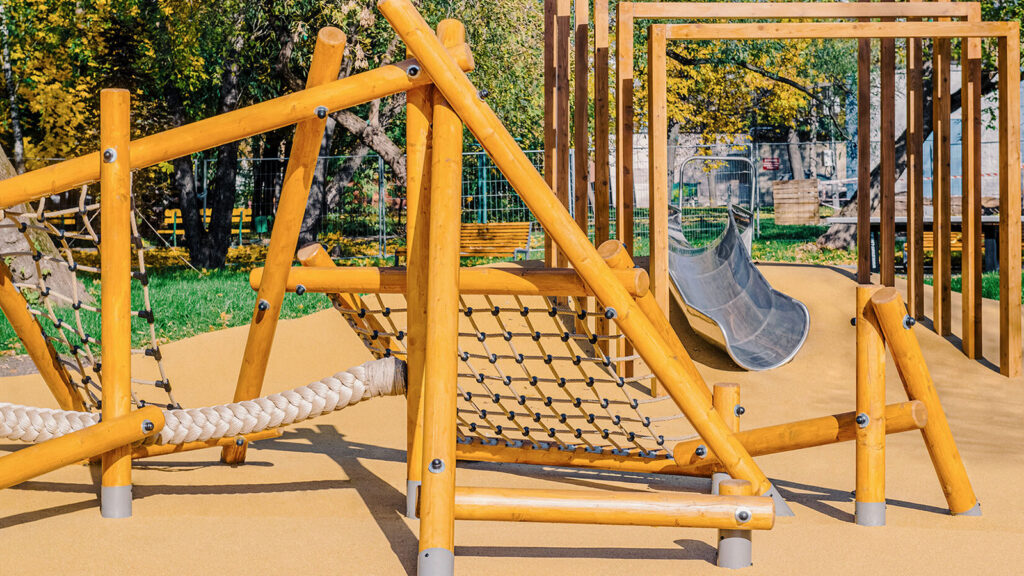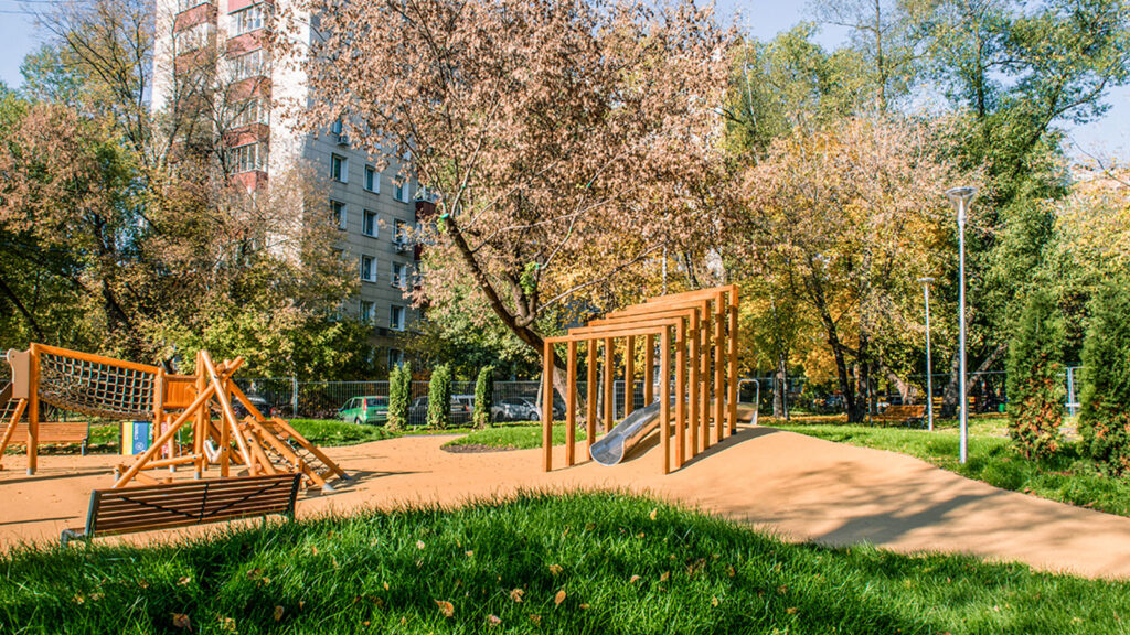 Для детей в общественном пространстве предусмотрели лазательные комплексы, встроенные батуты, горки, качели. Площадка для малышей с одной стороны «укрыта» удобной перголой-беседкой, а с другой стороны дополнена длинной скамейкой, для удобства родителей.