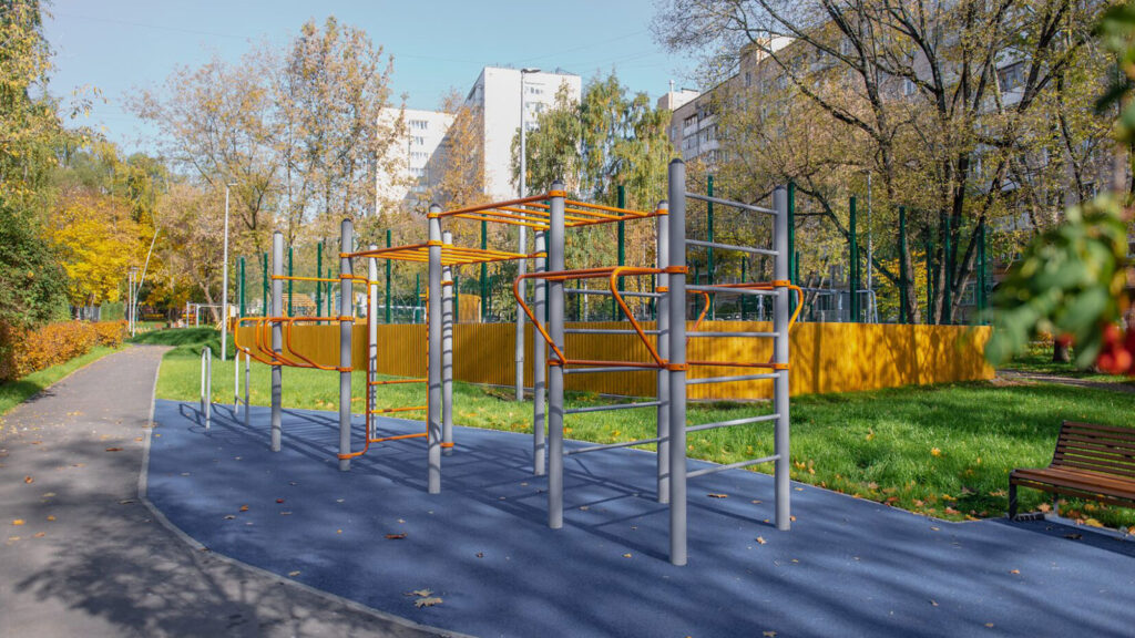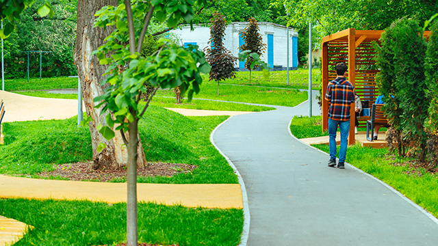Общественное пространство окружено кольцевым прогулочным маршрутом длиной около 200 м – по нему удобно гулять с коляской, учиться кататься на велосипеде, бегать или просто неспешно прогуливаться.