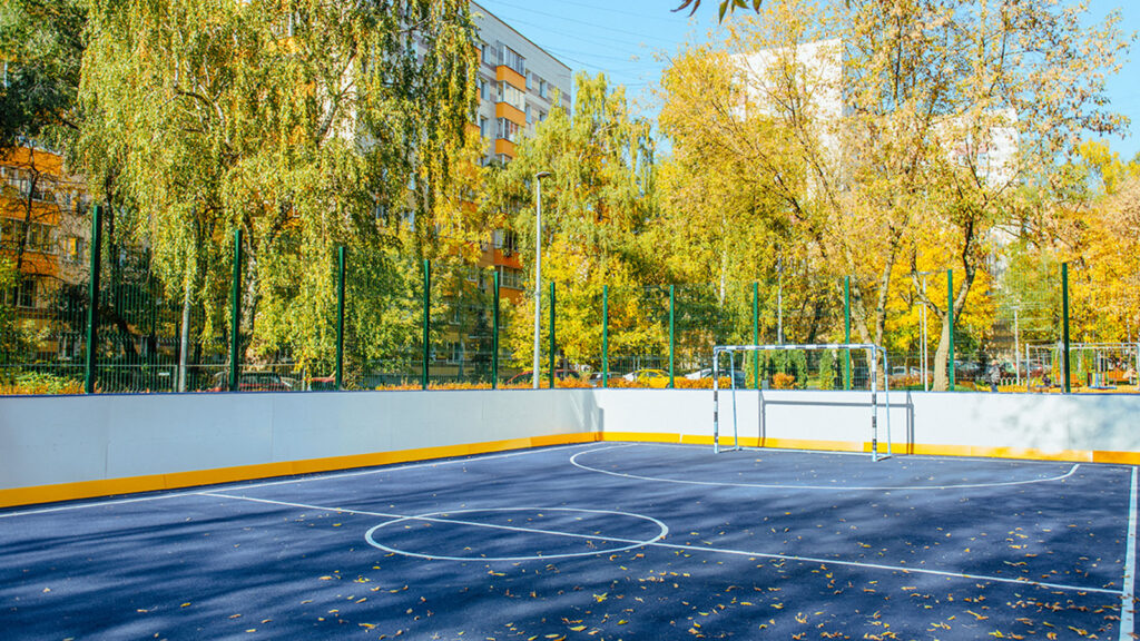 Основной задачей архитекторов было правильно продумать зонирование пространства. Центральное место на склоне занимала спортивная коробка. В новом проекте ее переместили на ровный участок, чтобы освободить центр для детской игровой зоны с навесами по периметру.