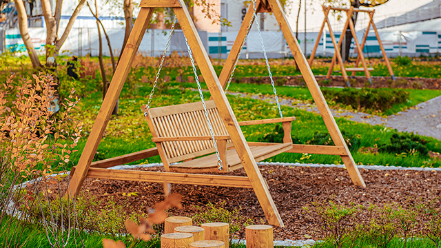 Организована зона тихого отдыха с качелями и столом для настольных игр.